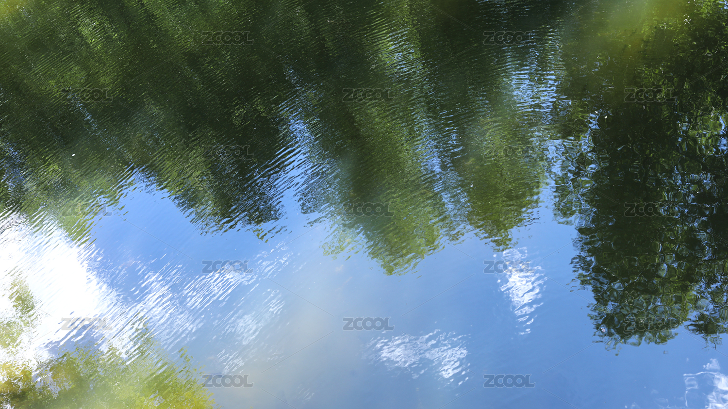 晴朗天气蓝天白云下的树木和水面倒影背景图