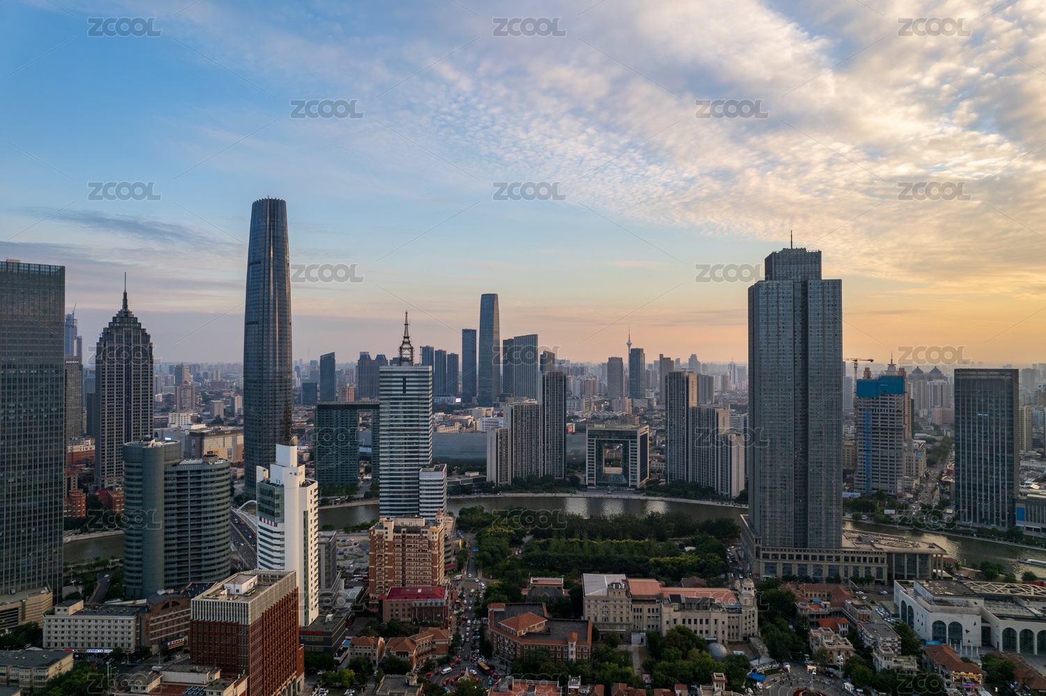 天津环球金融中心海河沿岸城市建筑日出朝霞