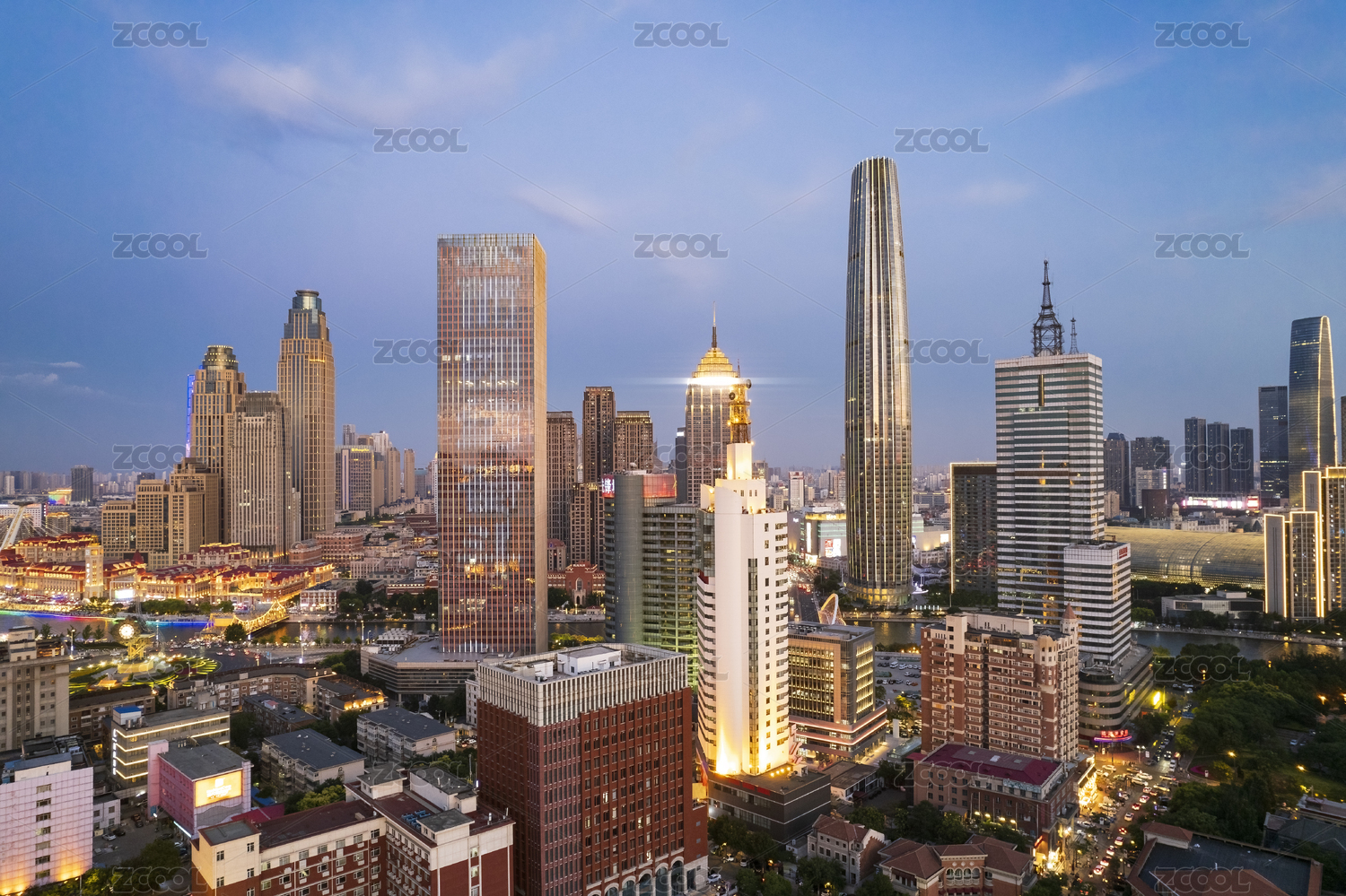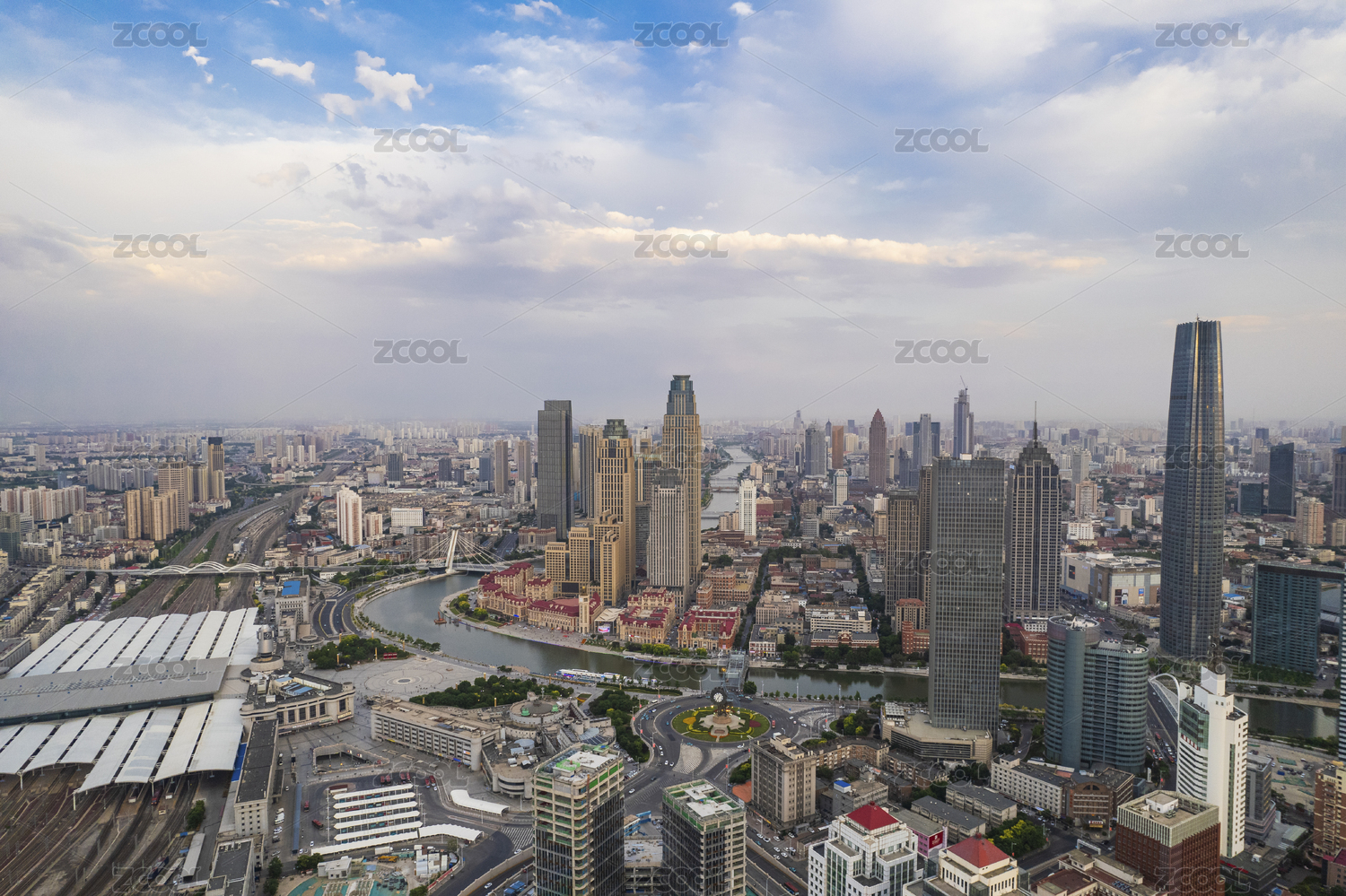 中国天津摩天大楼建筑群及城市街道地标航拍