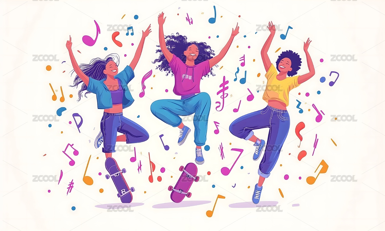 三个活力少女欢快跳跃,音乐符号飞舞