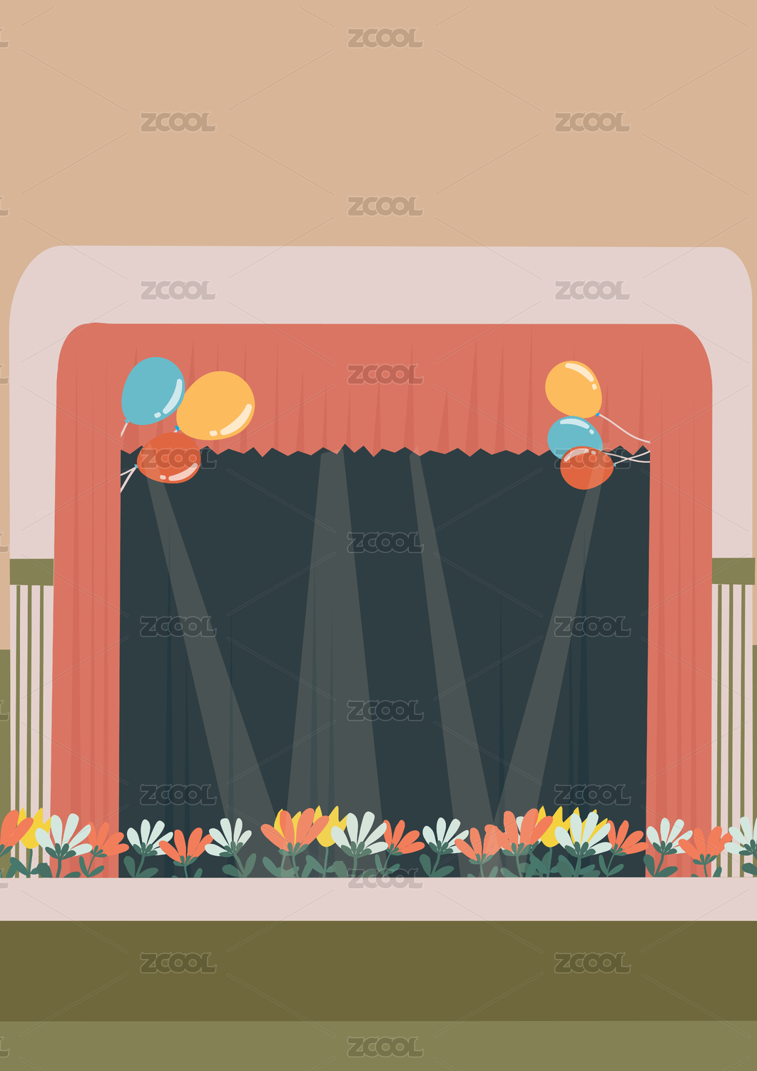 剧场舞台背景鲜花气球扁平矢量插画竖版无字