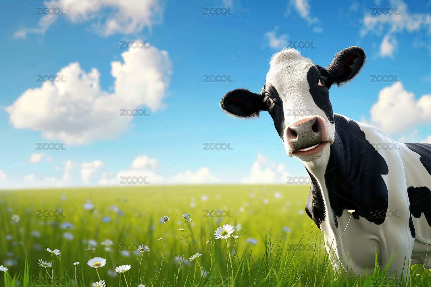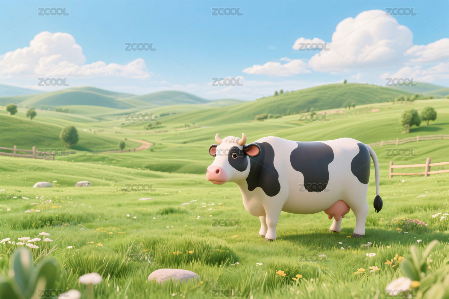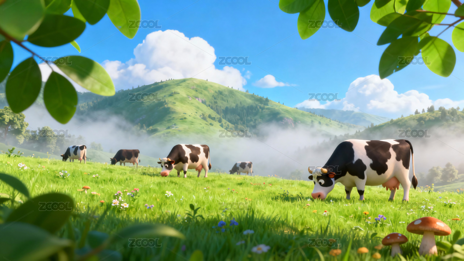 奶牛,卡通,可爱,云朵,蝴蝶,花朵,草地,草坪,蓝天,白云