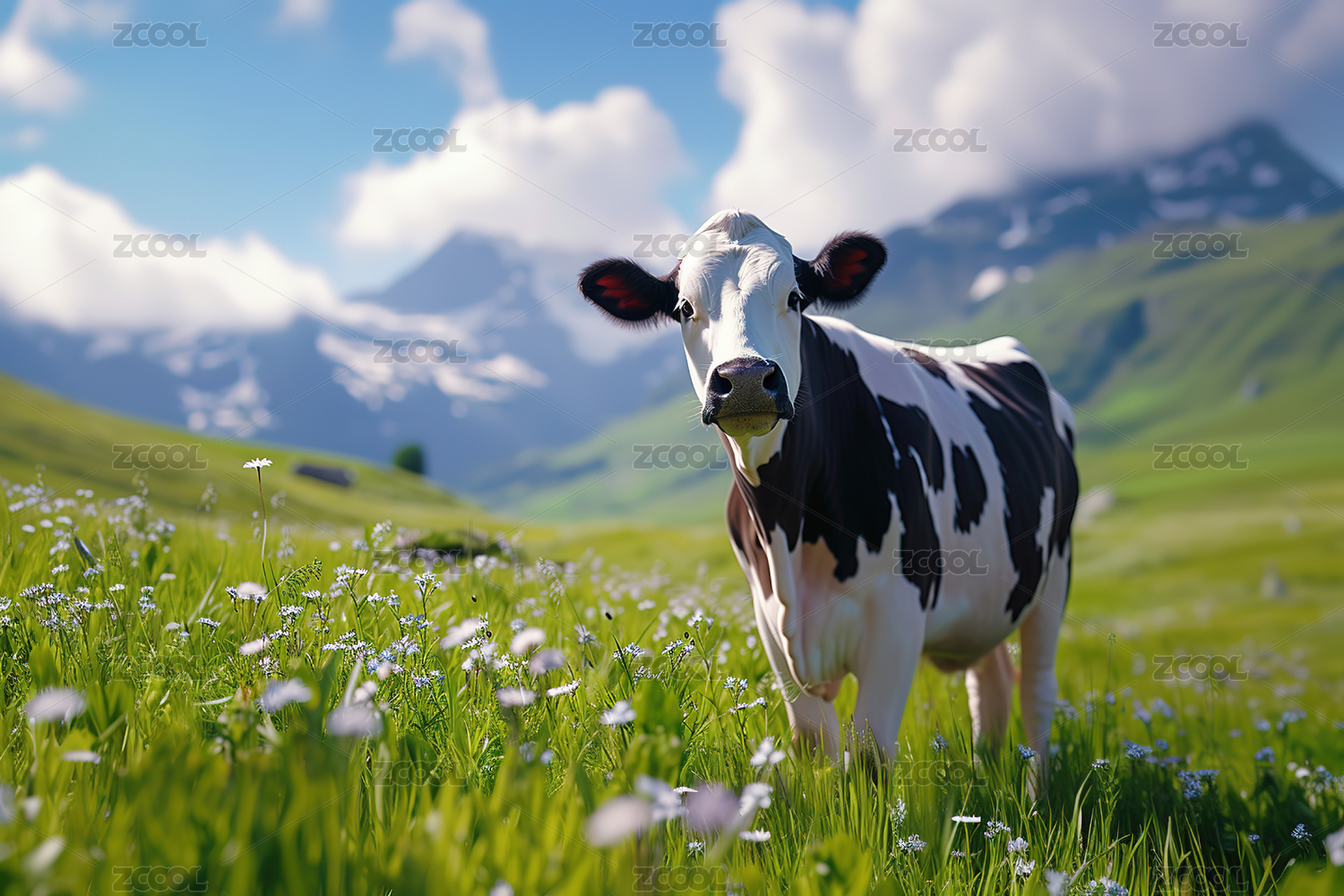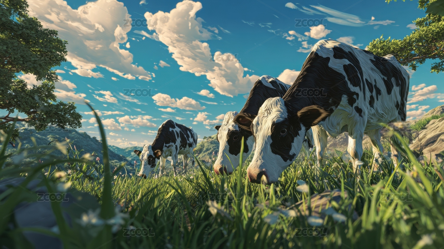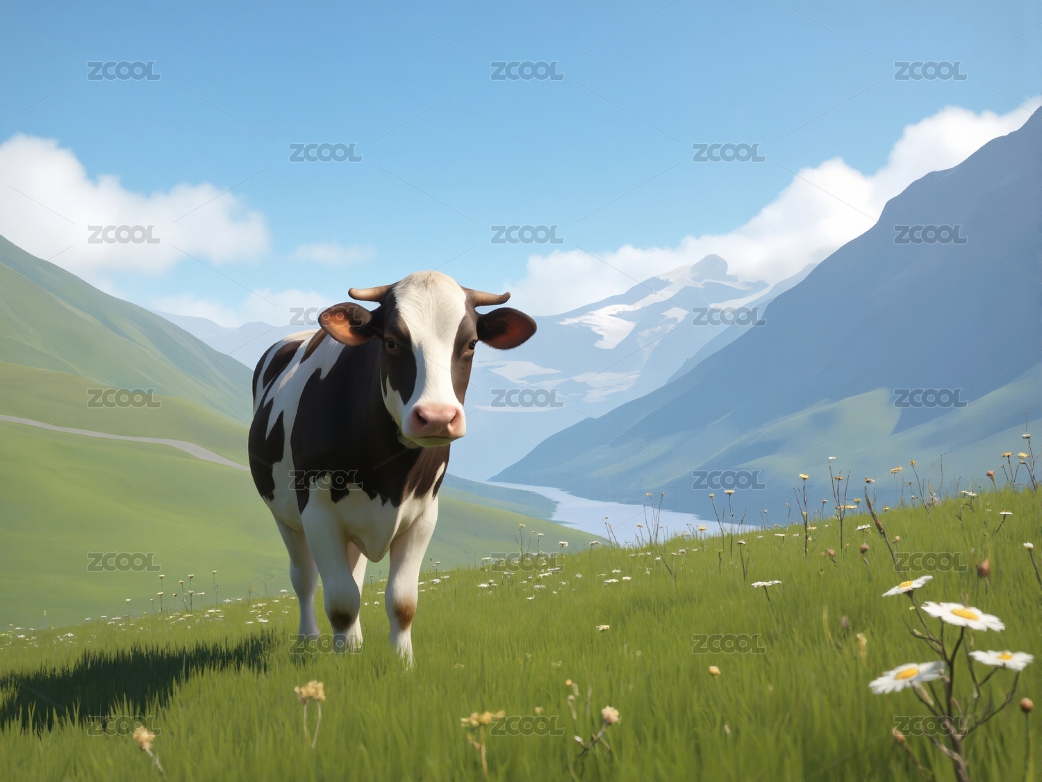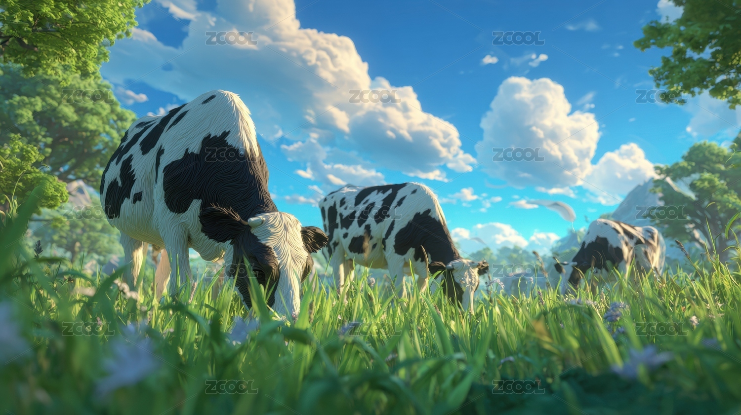 奶牛,卡通,可爱,云朵,蝴蝶,花朵,草地,草坪,蓝天,白云