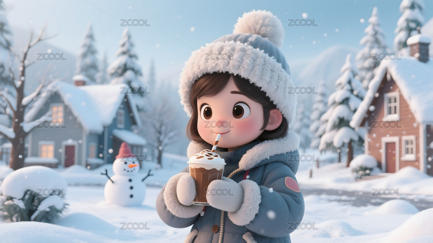雪人,冬天,下雪,雪地,房屋,树林,棉衣,儿童,女孩,粉色