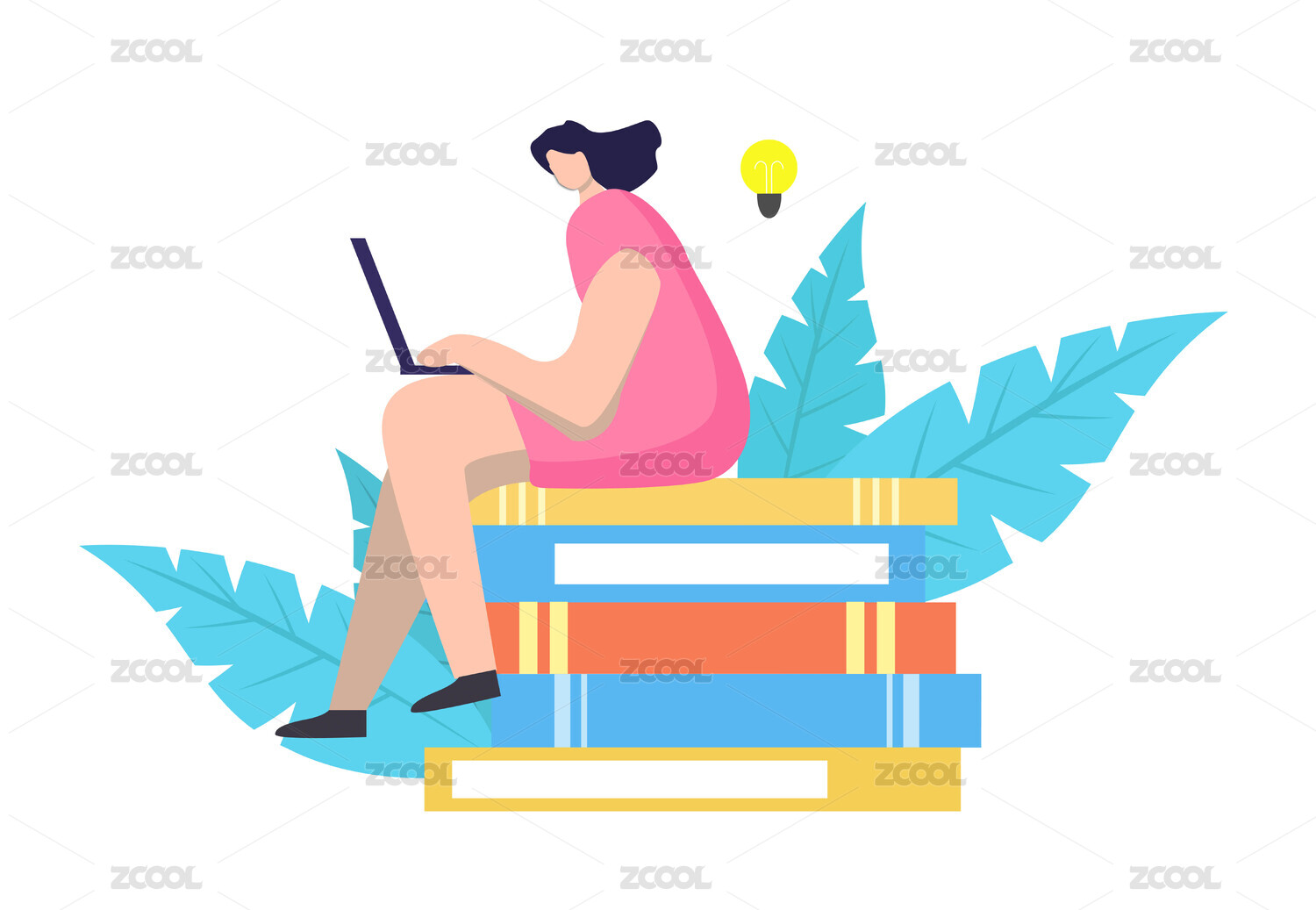 女生在一摞书上看书的插画