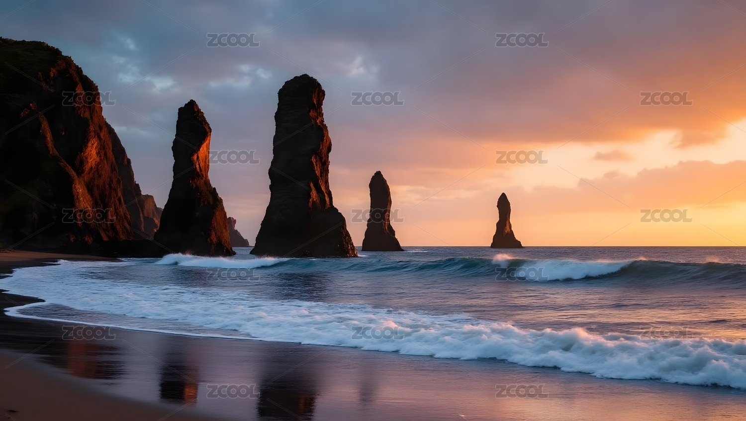 黄昏时分海边波浪拍打黑色沙滩远处山峦