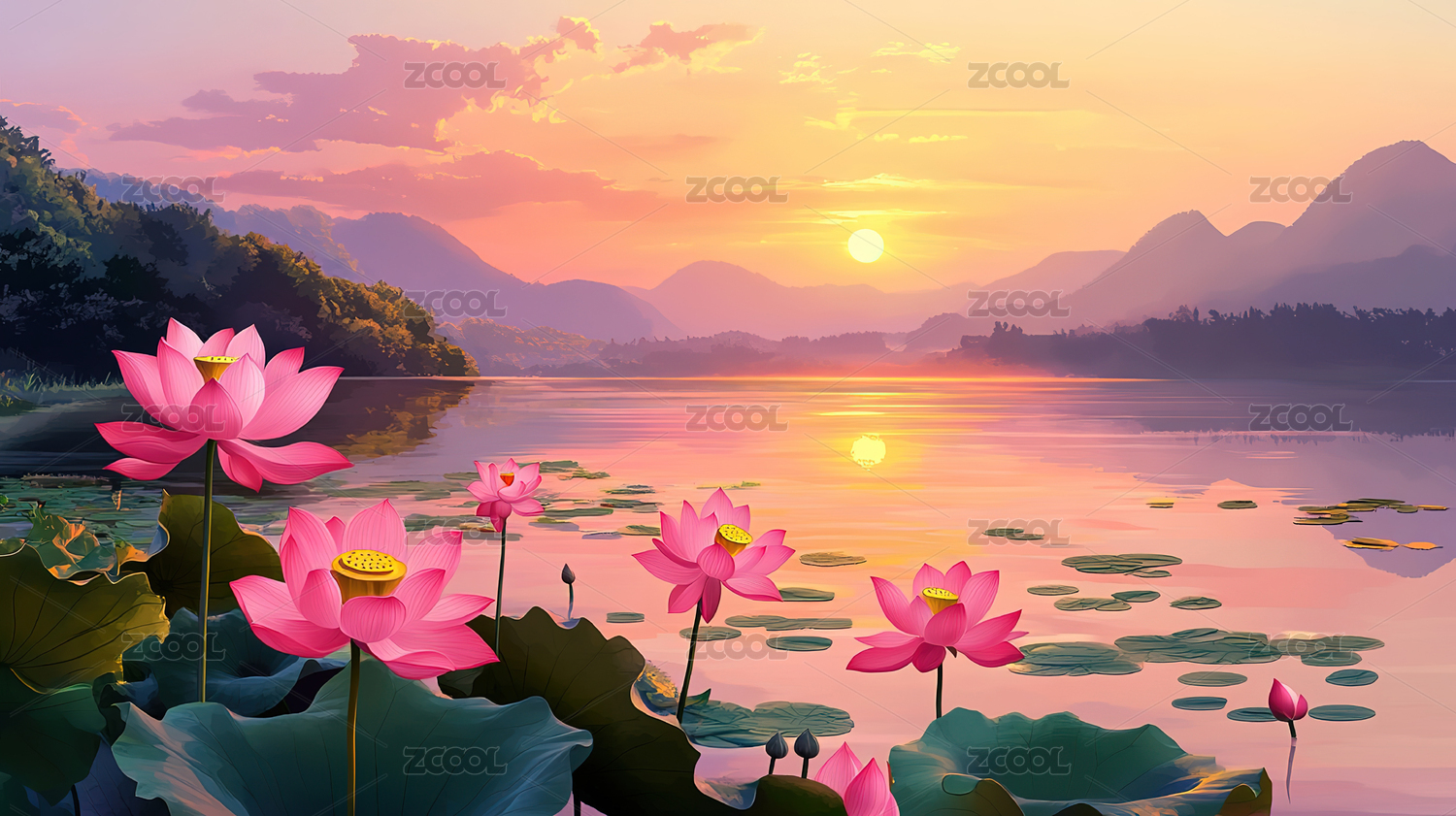 荷花塘风景插画国风海报,立夏节气荷花池概