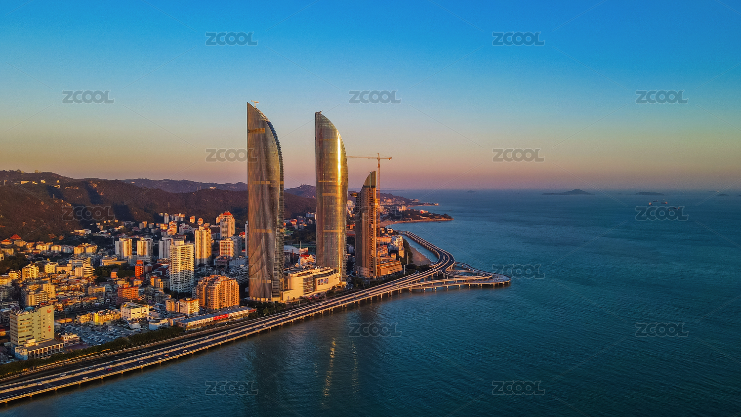 中国福建省厦门市海滨的世茂海峡大厦及周边建筑落日风光