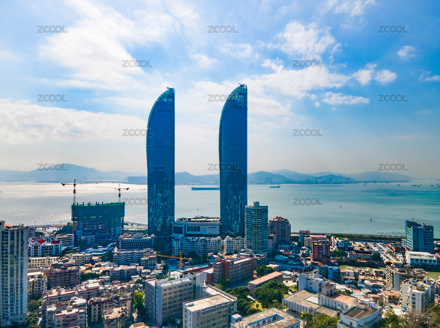 航拍中国福建省厦门双子塔—世茂海峡大厦