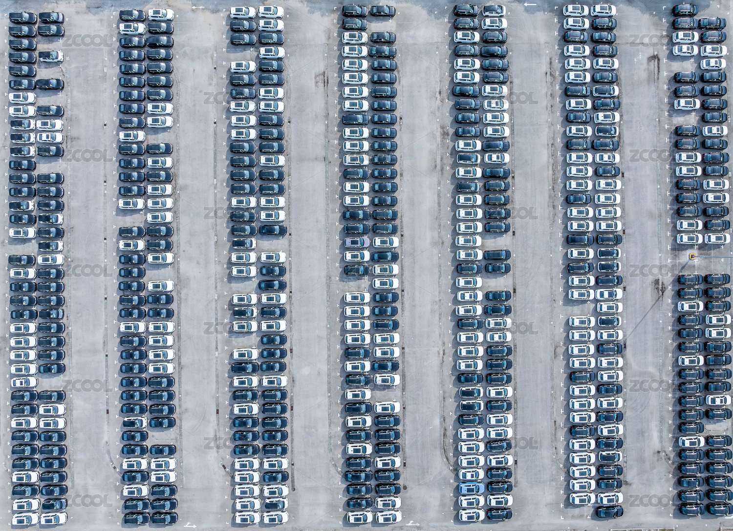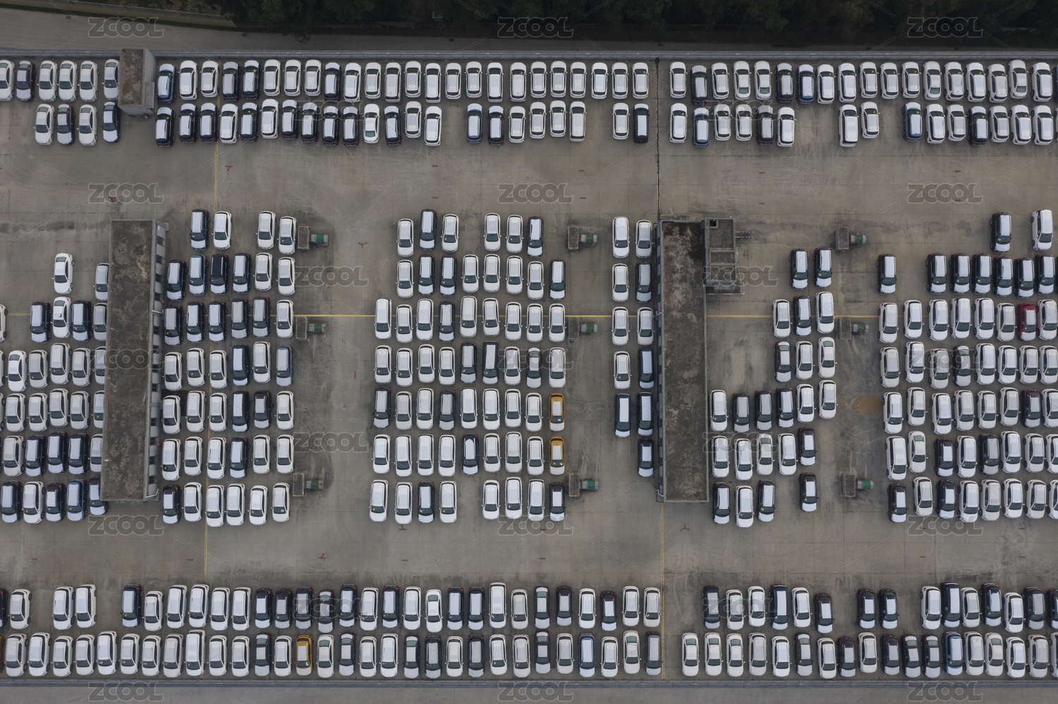 航拍晴天里的汽车生产基地里整齐停放着的等待出厂的汽车