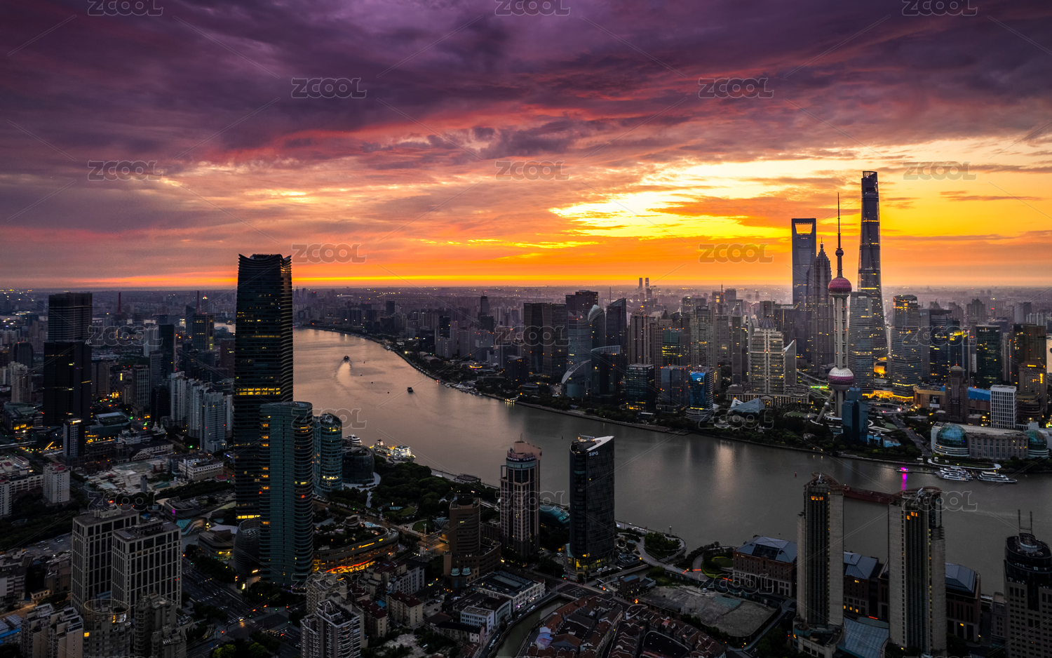 航拍日落时的中国上海市中心黄浦江沿岸风光