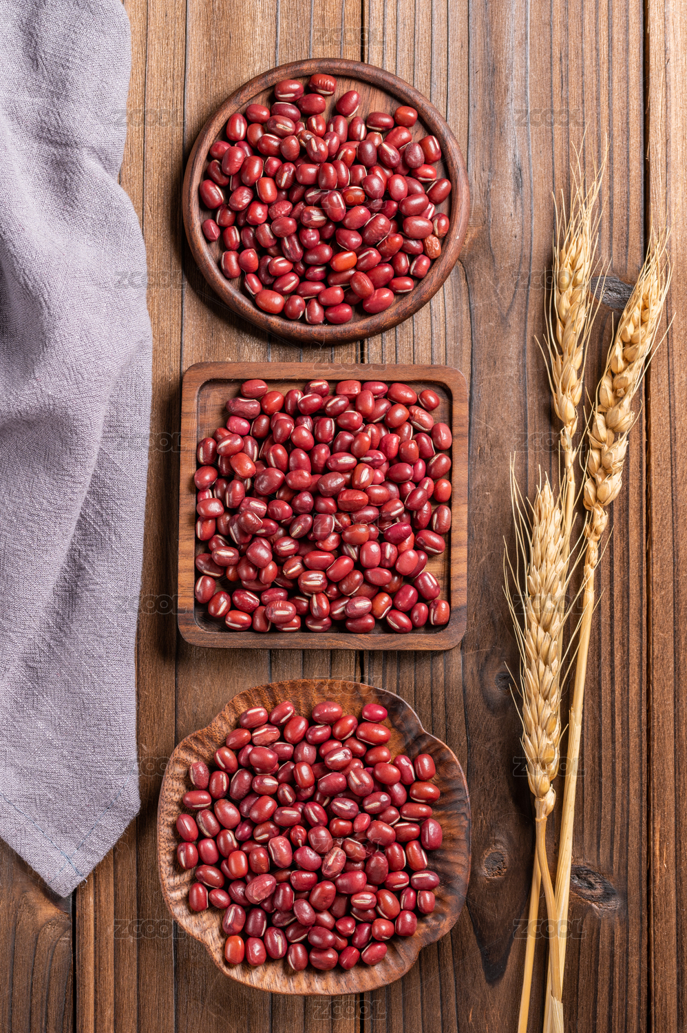 红豆,五谷,粗粮,粮食,美食,麦穗,木桌,木纹,木勺,木碟