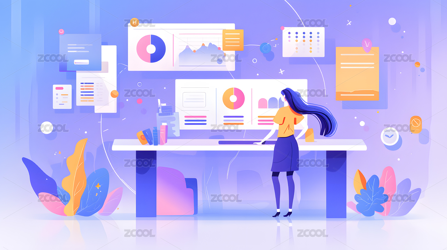 插画风格职场女性数据分析办公场景