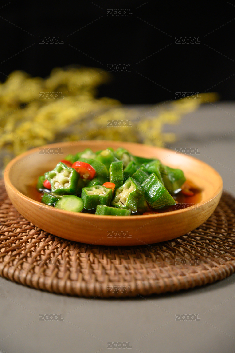 桌面上的盘子里的美味可口的凉拌秋葵