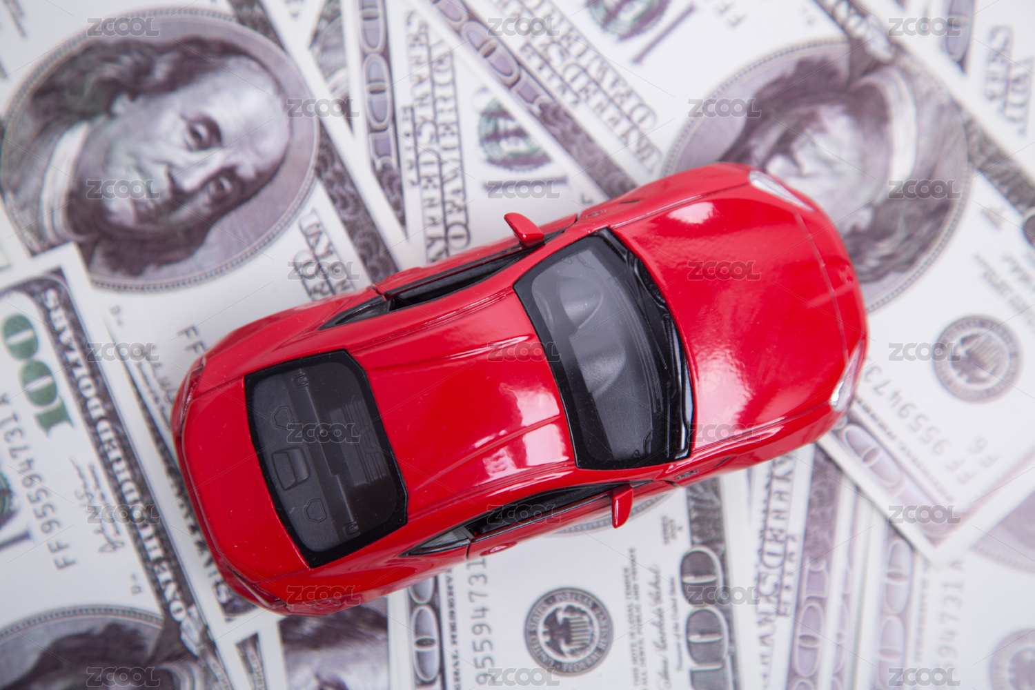 放在美元上的红色小汽车