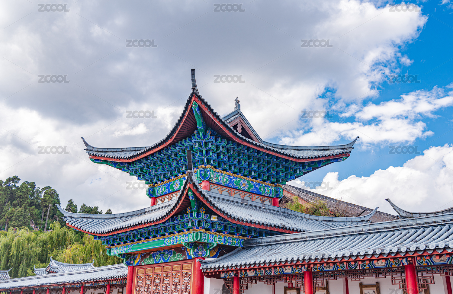 蓝天白云下的中国云南丽江古城木府建筑景观