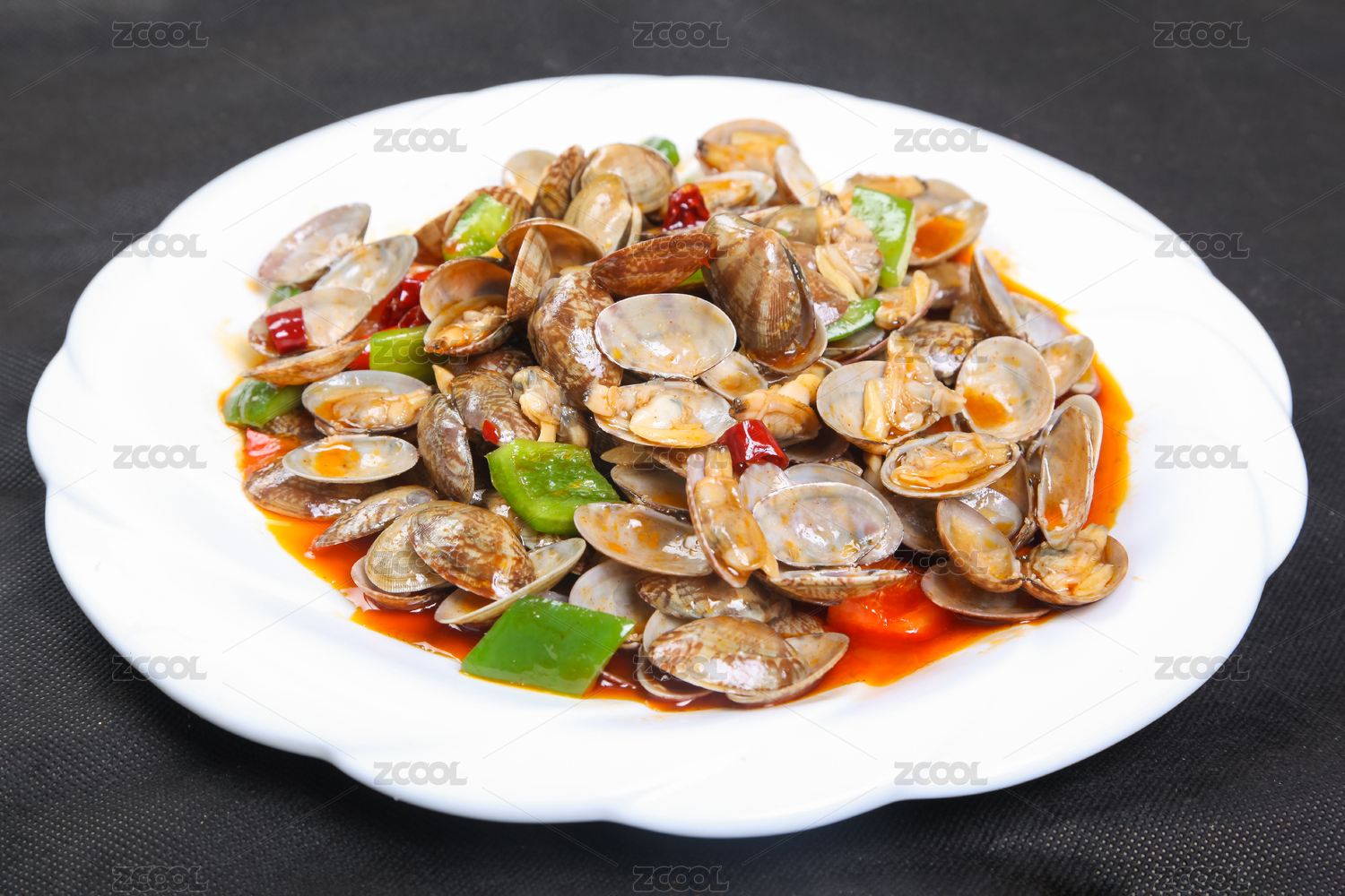 浅色背景上的一盘炒花甲,点缀着葱丝