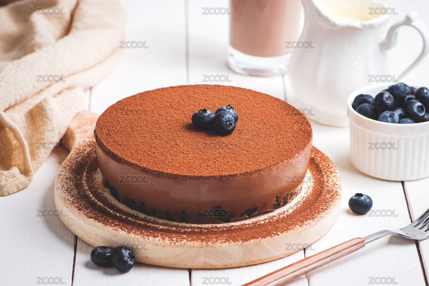 一份巧克力慕斯蛋糕放置在白色木桌上