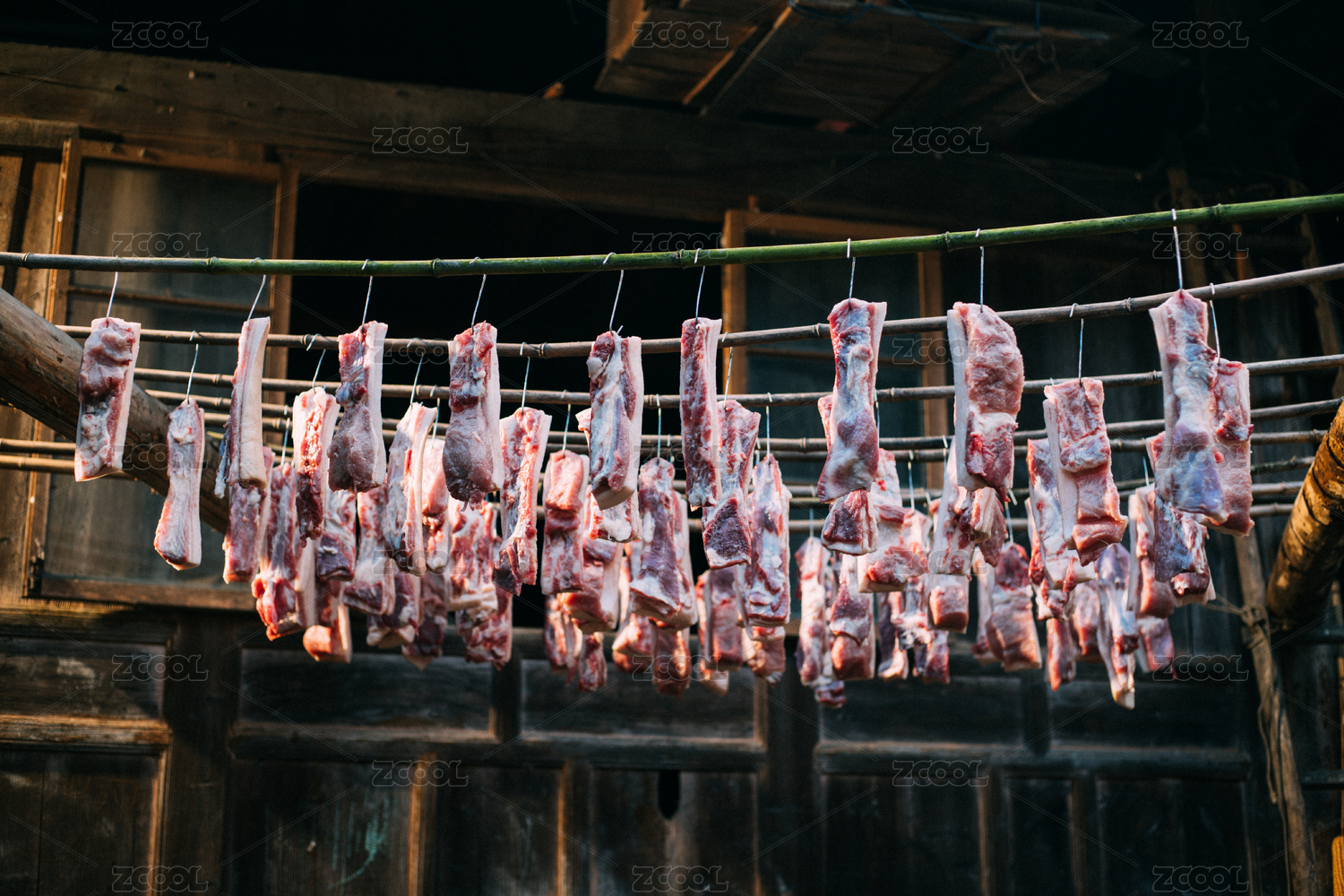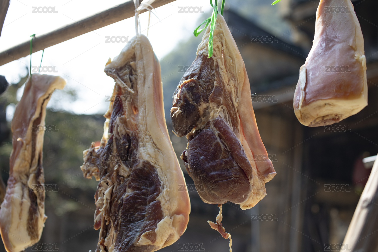 农村屋檐下悬挂的准备加工腊肉的肉块
