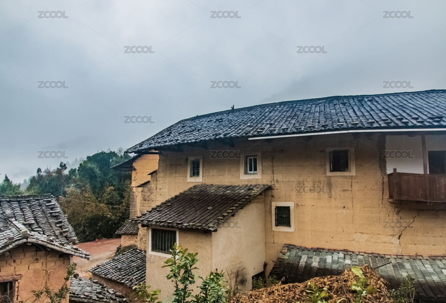 福建省龙岩市永定区湖坑镇新南村下雨天的土楼群建筑景观