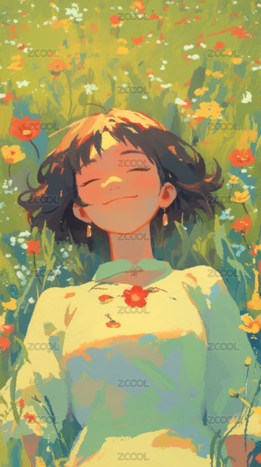 人,女孩,年轻,草地,阳光,森林,夏天,猫咪,动物,漫画