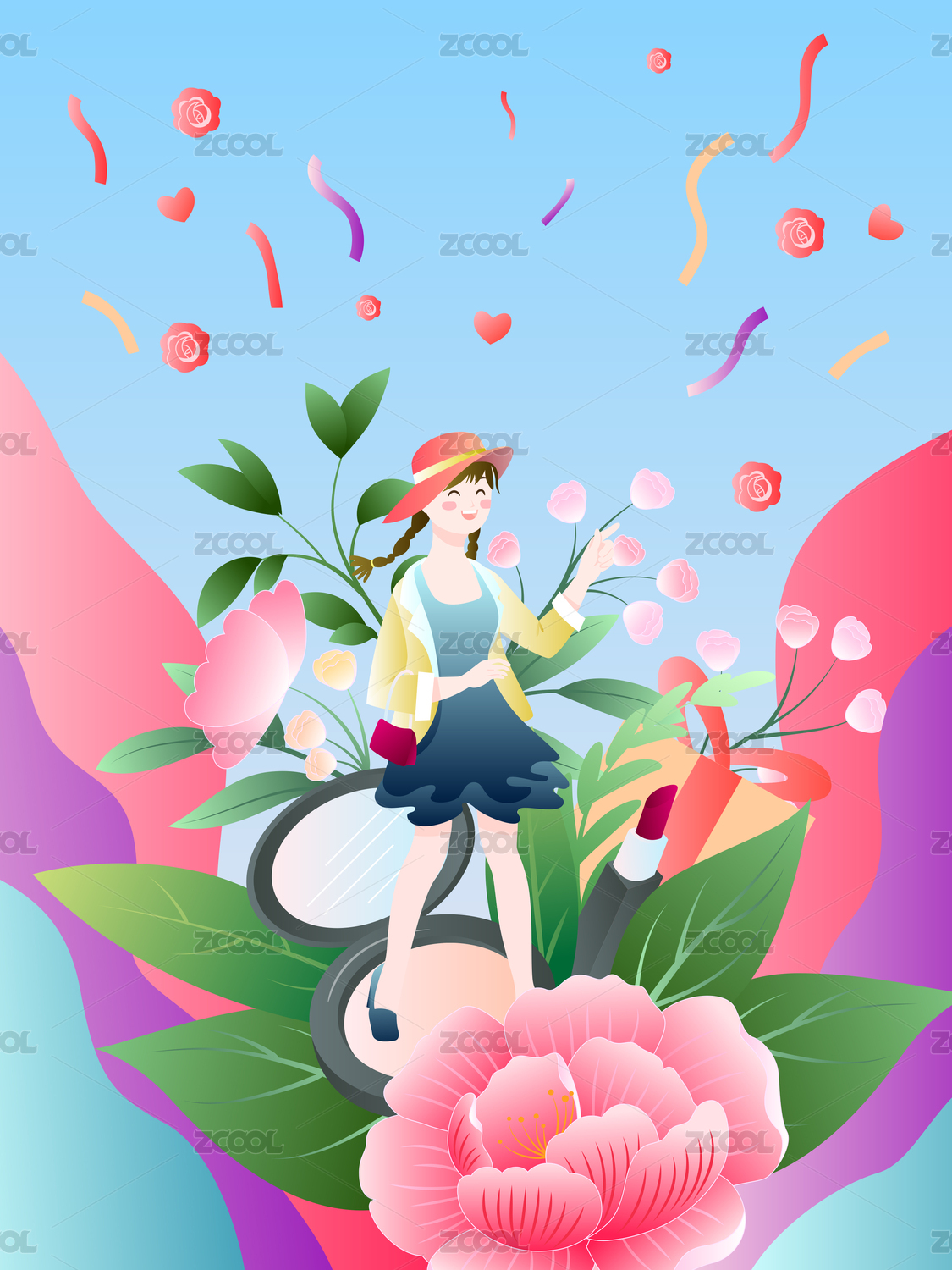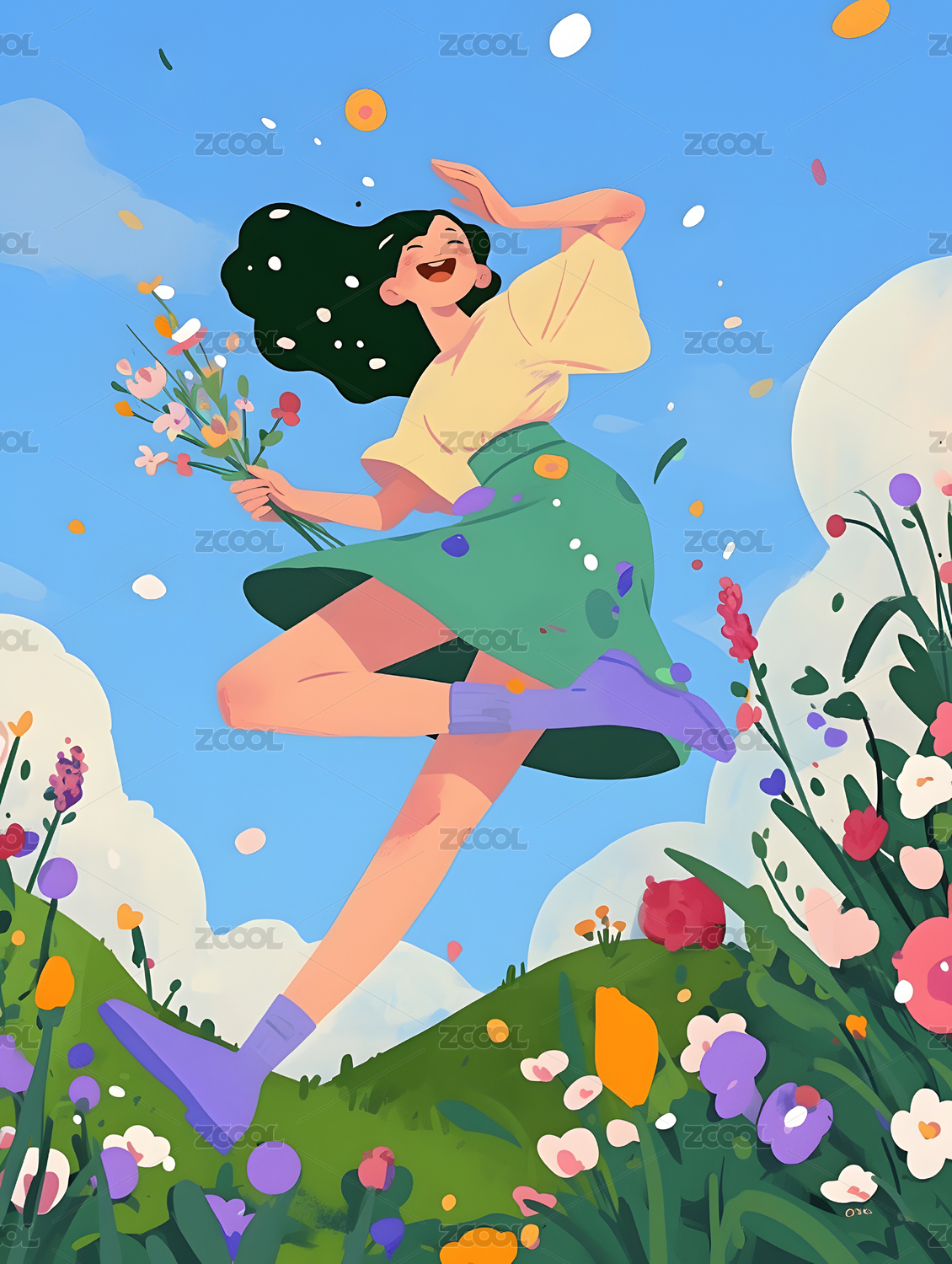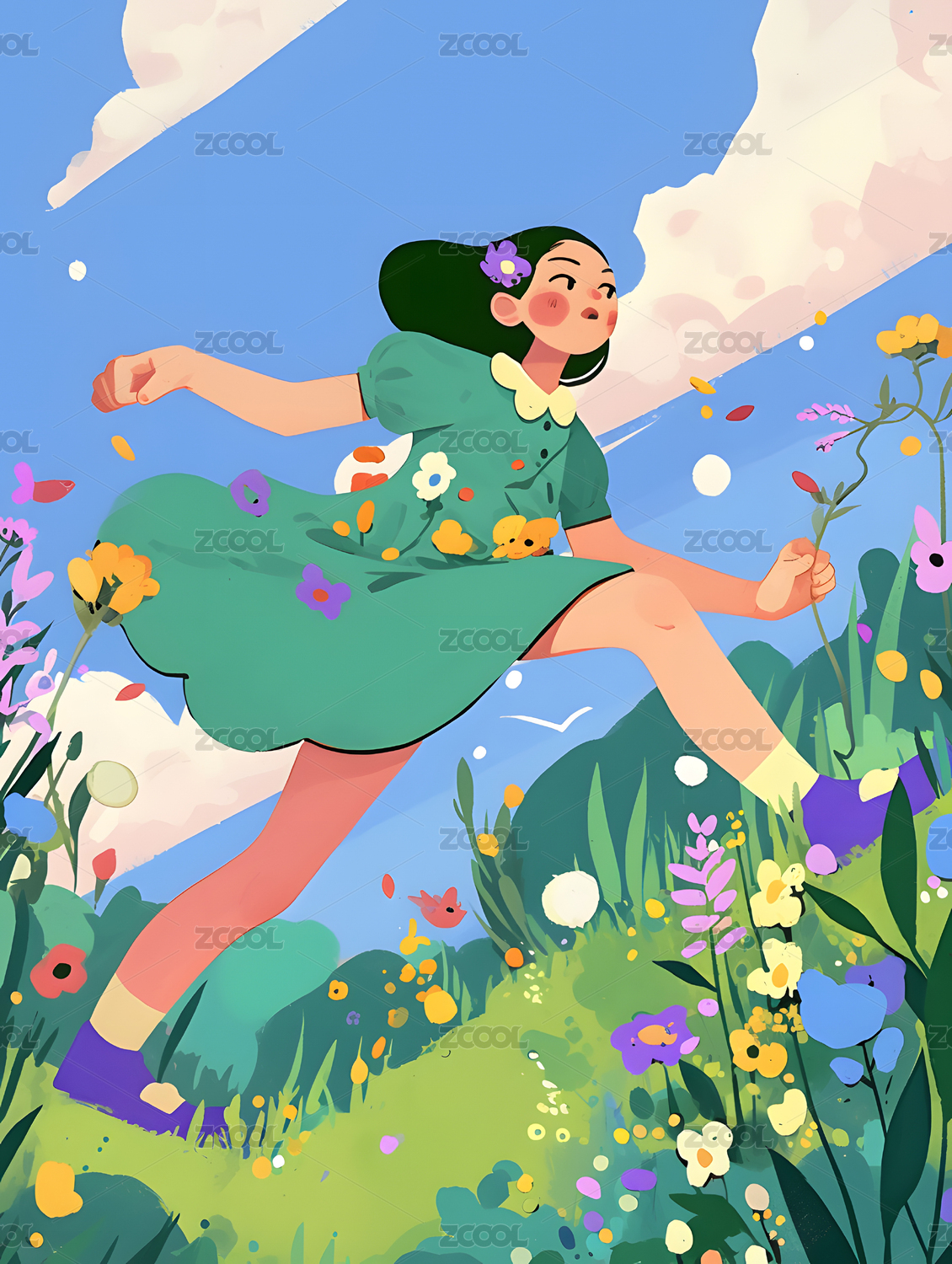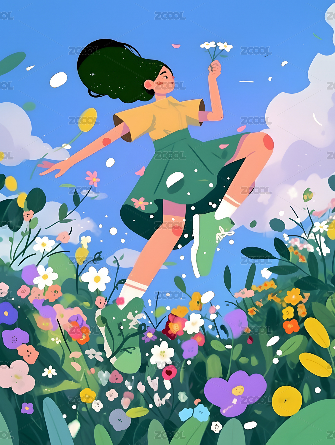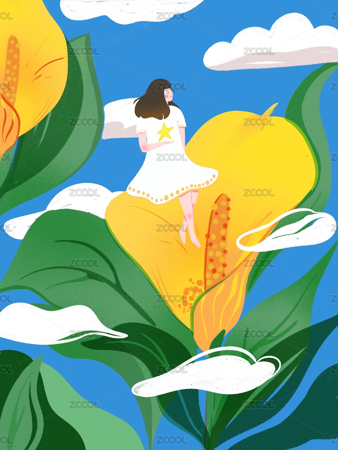 可爱女孩坐在花上手捧星星春天夏天季节清新
