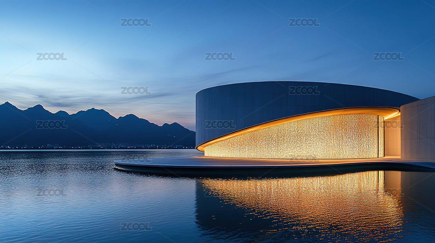 现代建筑与湖泊山景