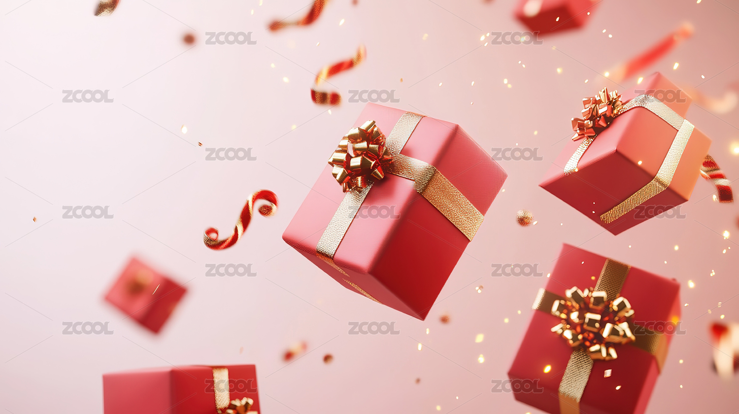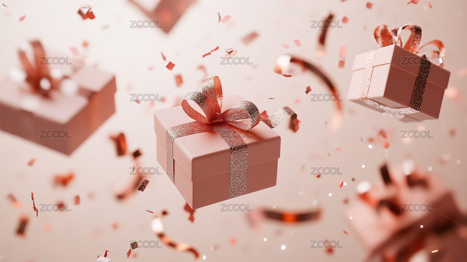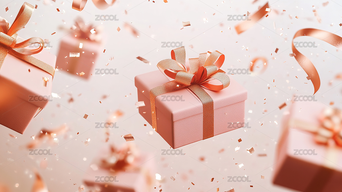 一个粉色礼品盒,周围飘散着各种彩带