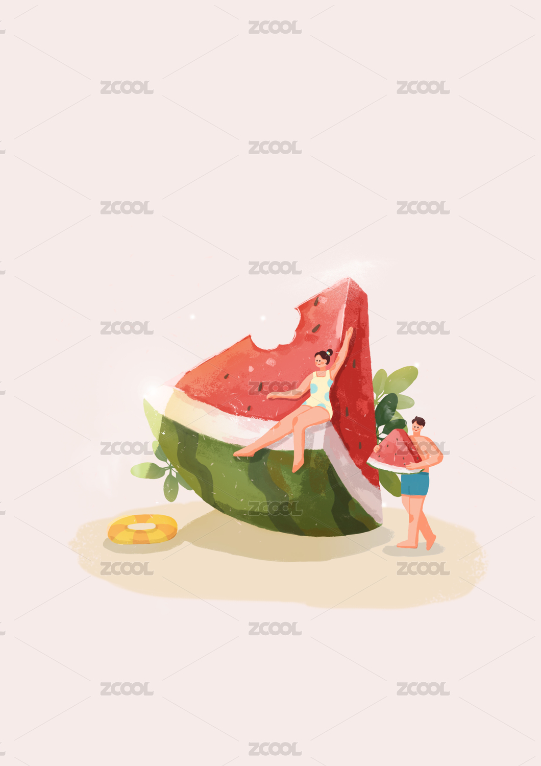 在哈密瓜上跳舞的小女孩扁平肌理插画