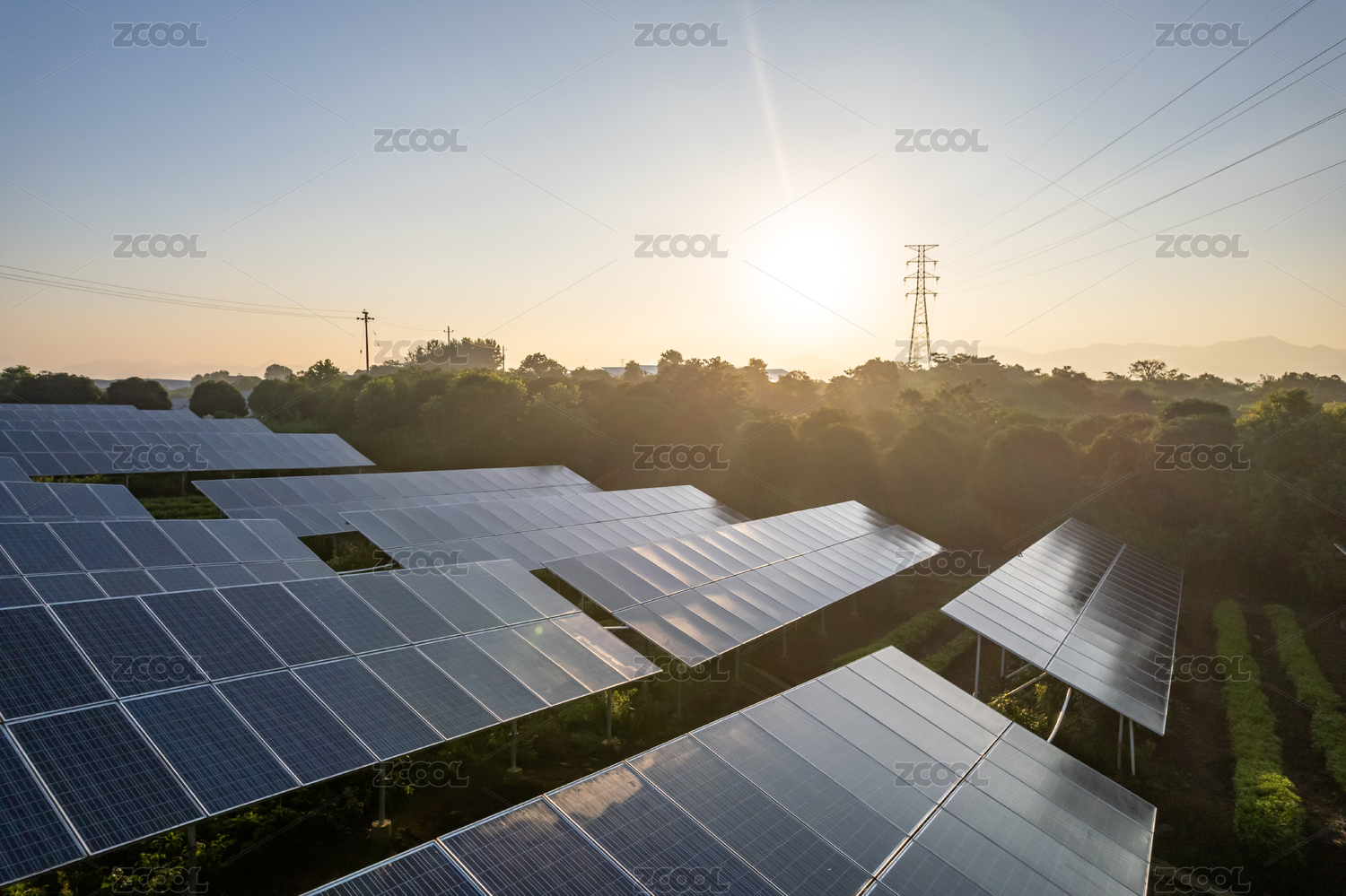 航拍俯瞰绿色乡村搭建好的光伏板太阳能发电