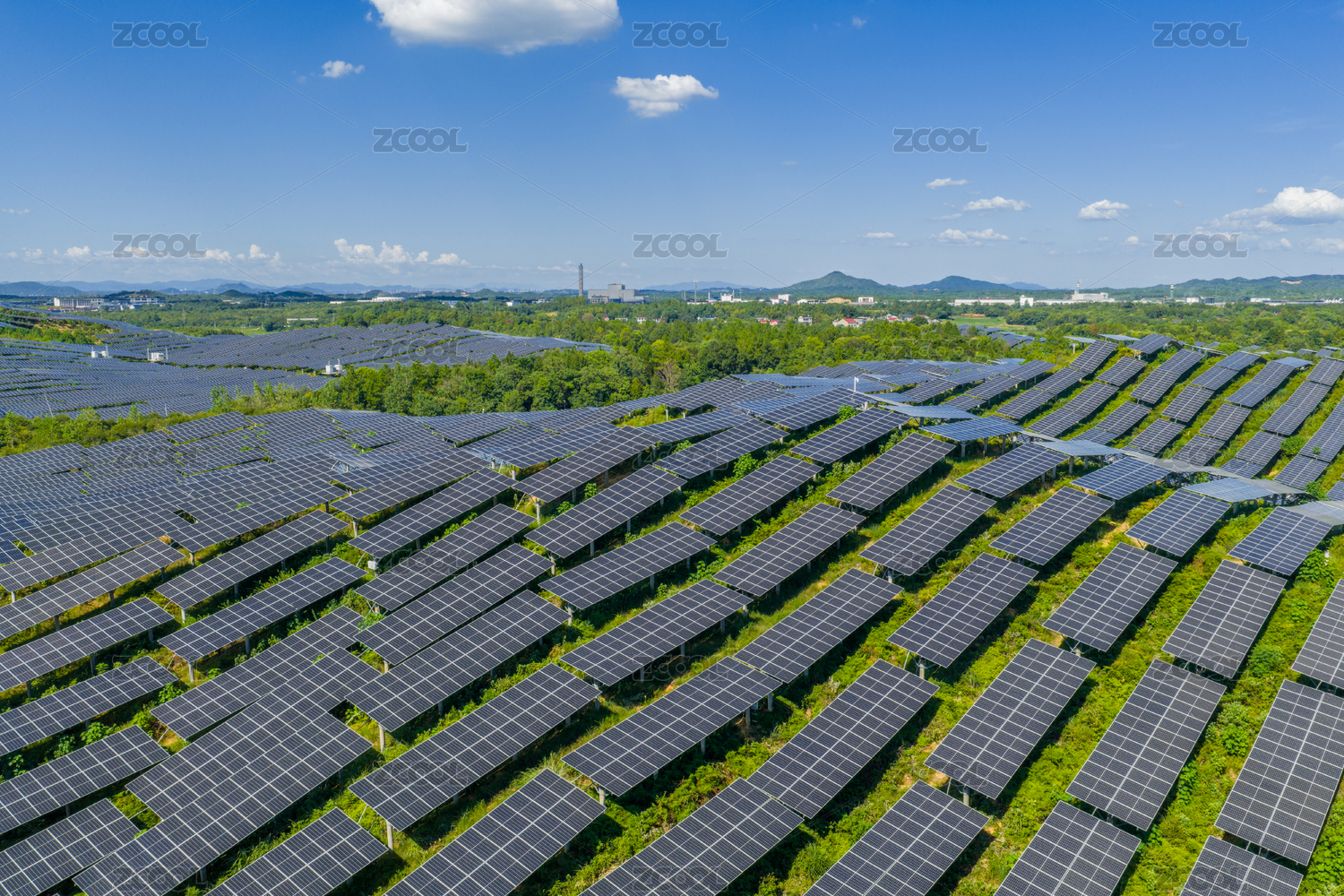 蓝天白云下的山东枣庄龙牙山荒山光伏发电站