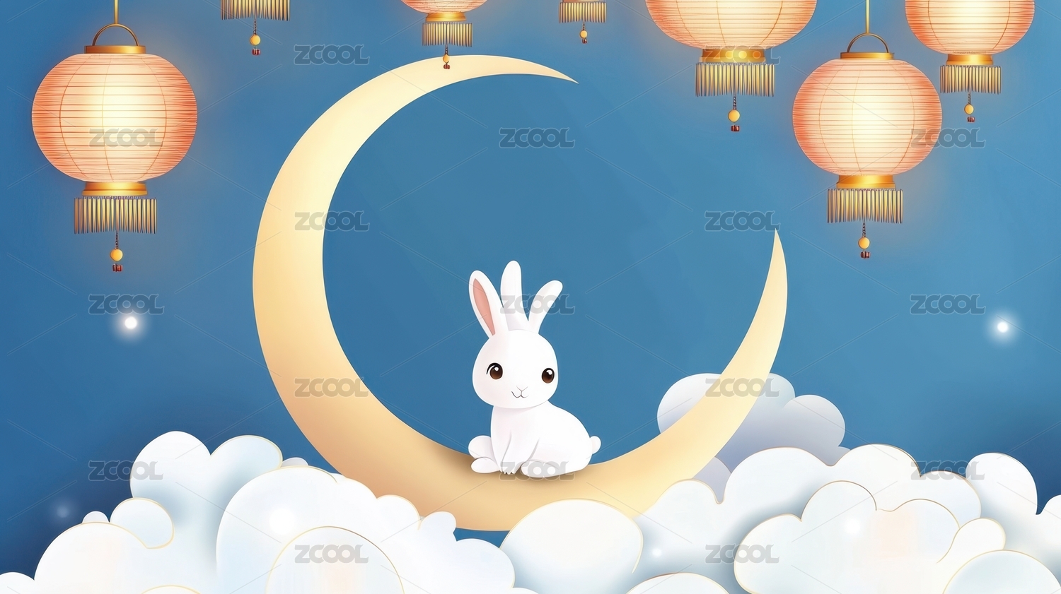 中秋节,满月、祥云、月饼和玉兔,动漫风格