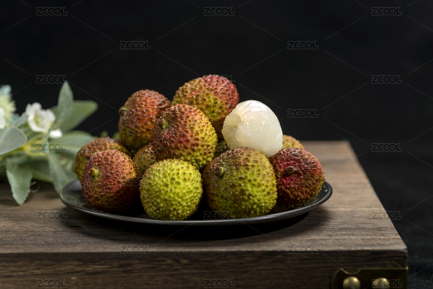 棚拍木纹桌面上中国风静物荔枝