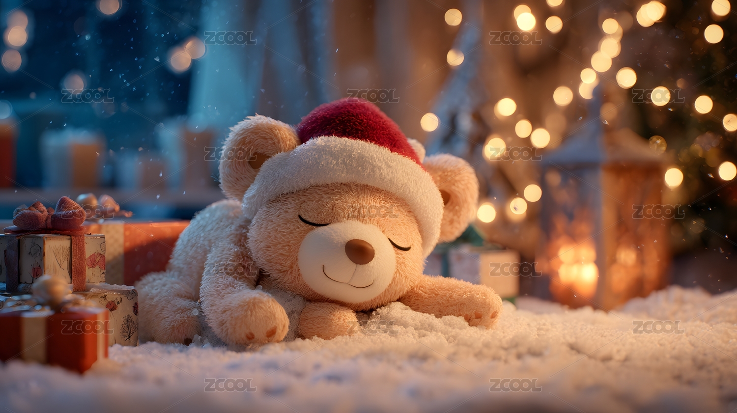 圣诞节毛绒熊 雪地睡觉 温馨氛围
