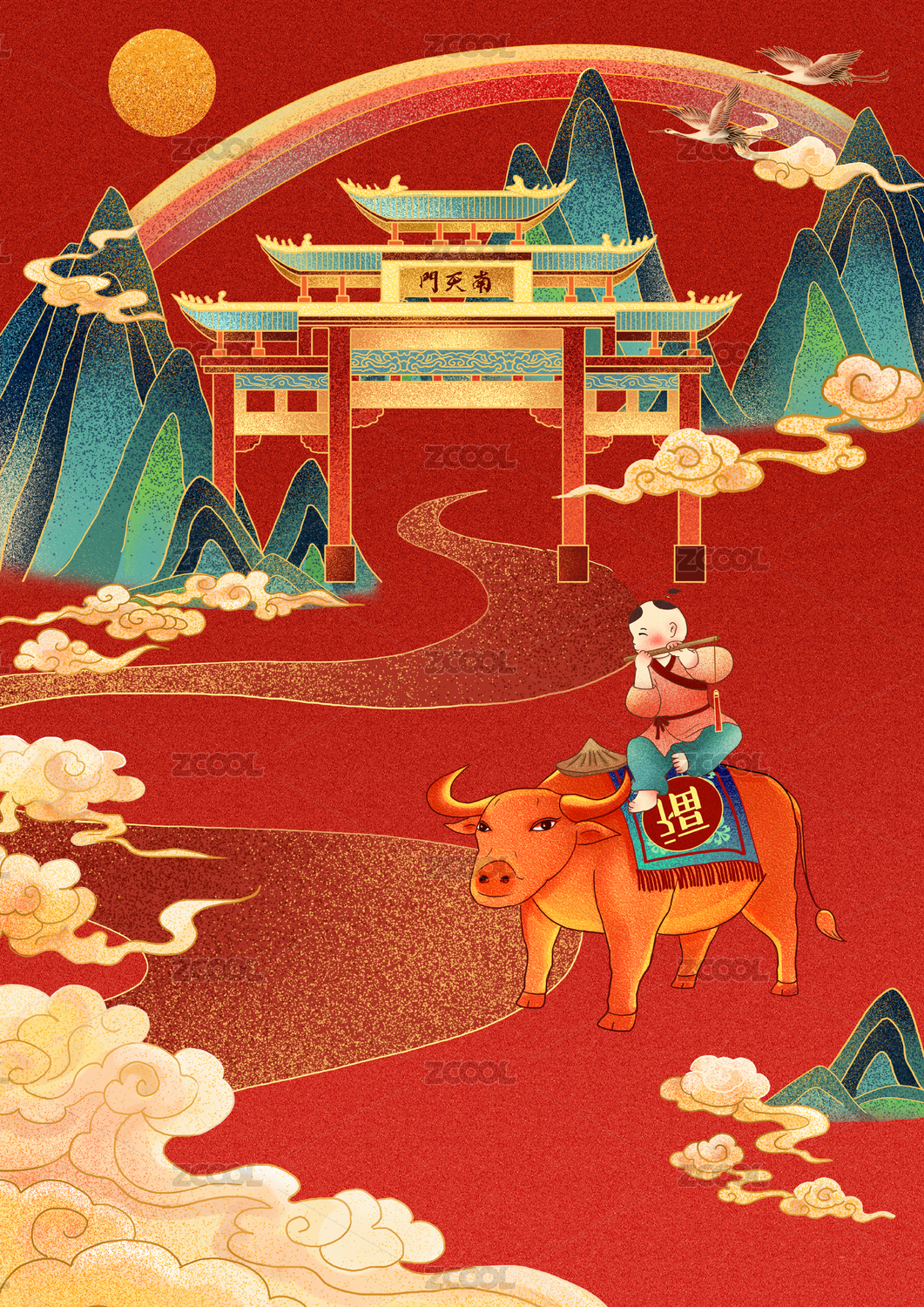 HEZODIAC2021,牛年,2021,节日,新年,春节,儿童,童子,骑牛,动物