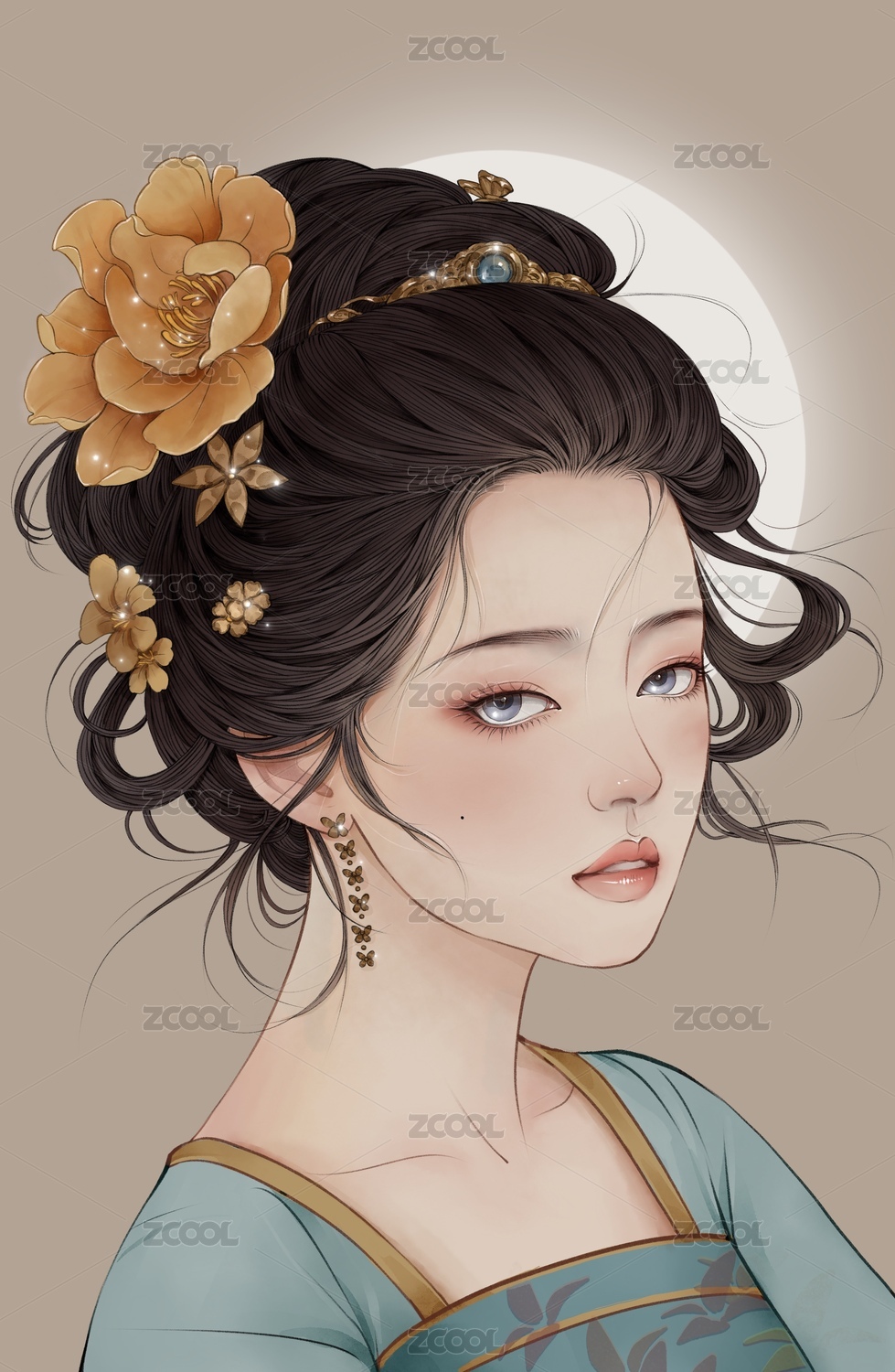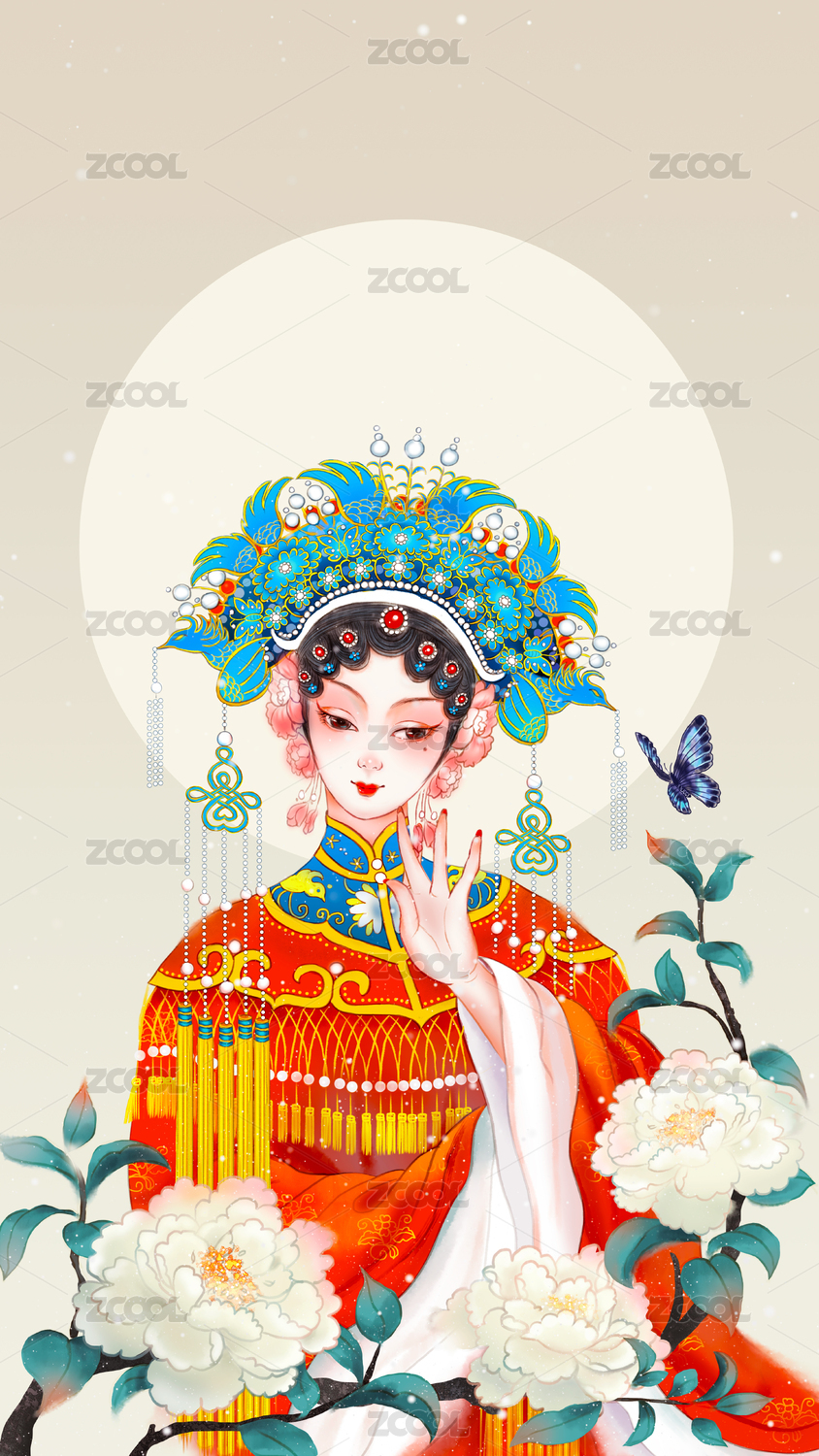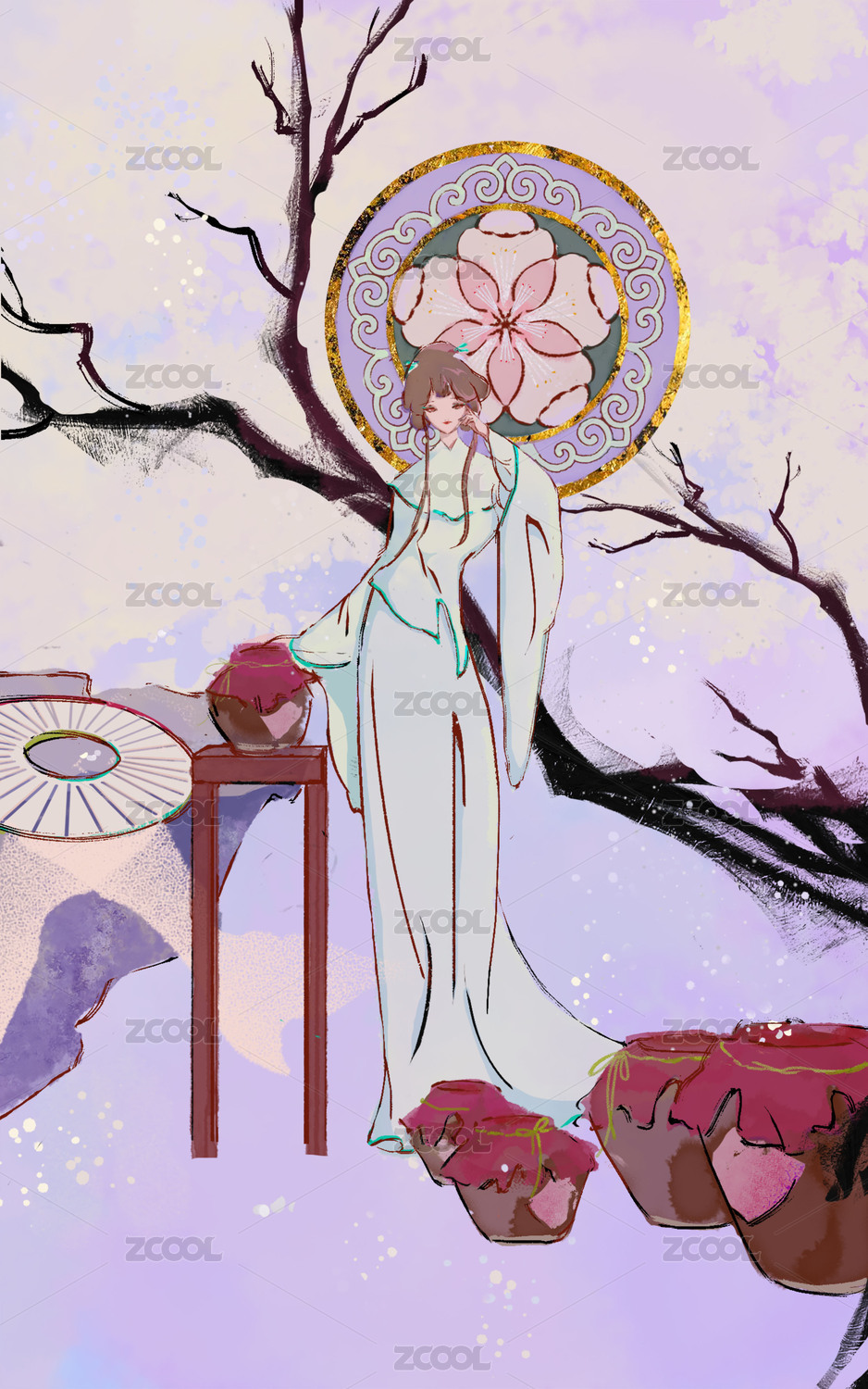 牡丹,白牡丹,古风,美女,花神,插画,女生,拟人,春季,月亮