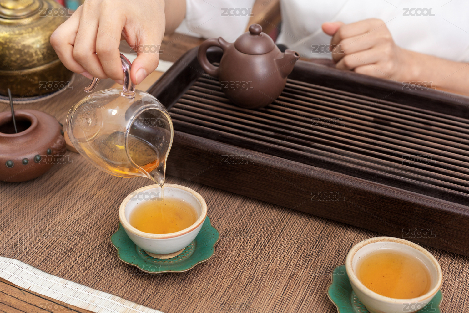 木纹茶桌上倒茶的一瞬间