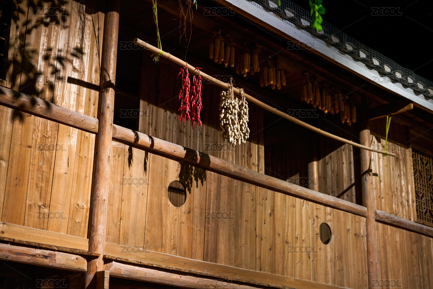农村民房二楼走廊上挂着的一串串玉米