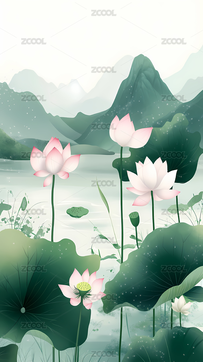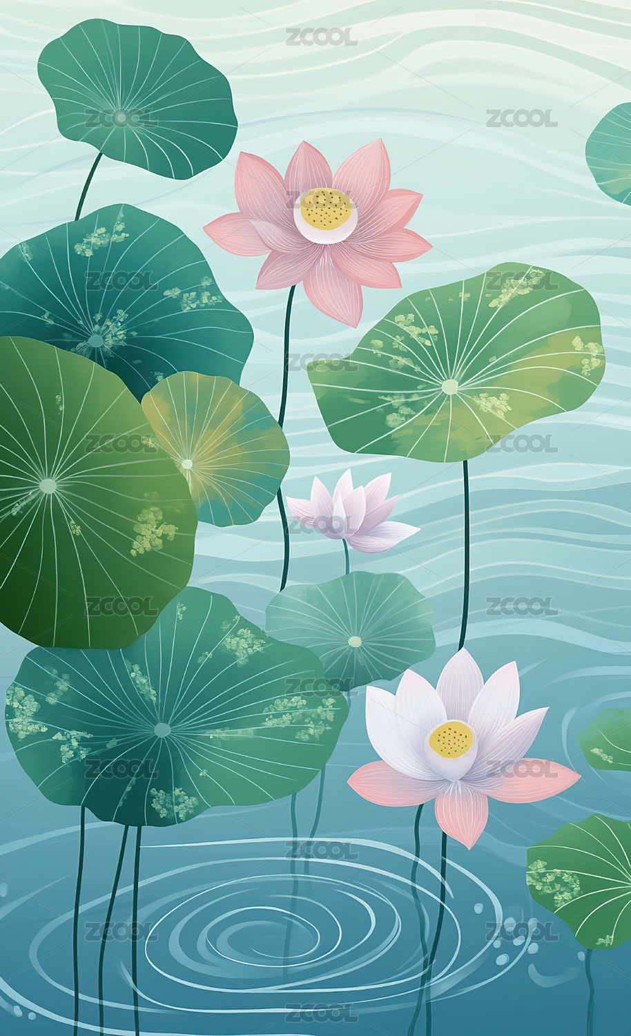 夏至荷塘盛开荷花与碧绿荷叶手绘插画