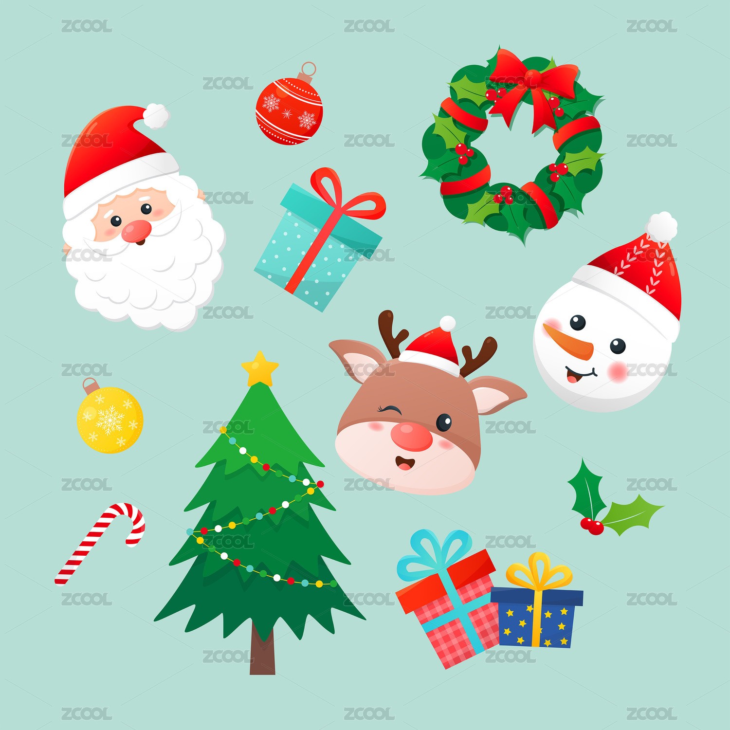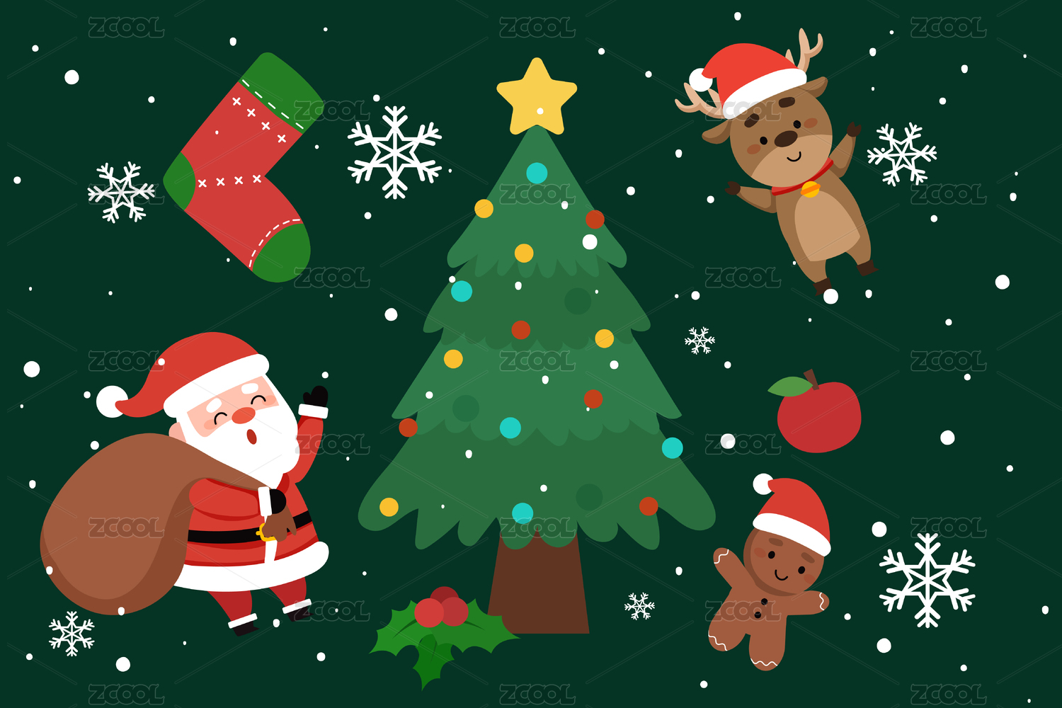 扁平圣诞树圣诞老人装饰元素Flat christmas elements, reindeer with santa pattern decoration. Merry Christmas Landscape. Vector