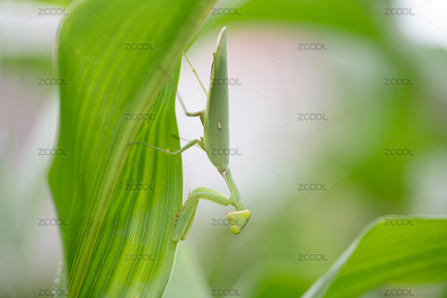 微距拍摄停栖在树枝上玩耍的小螳螂