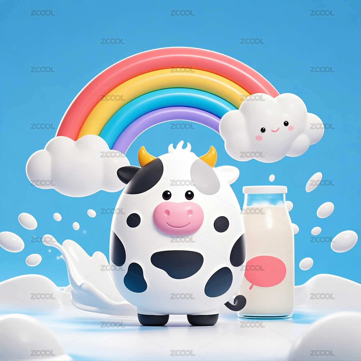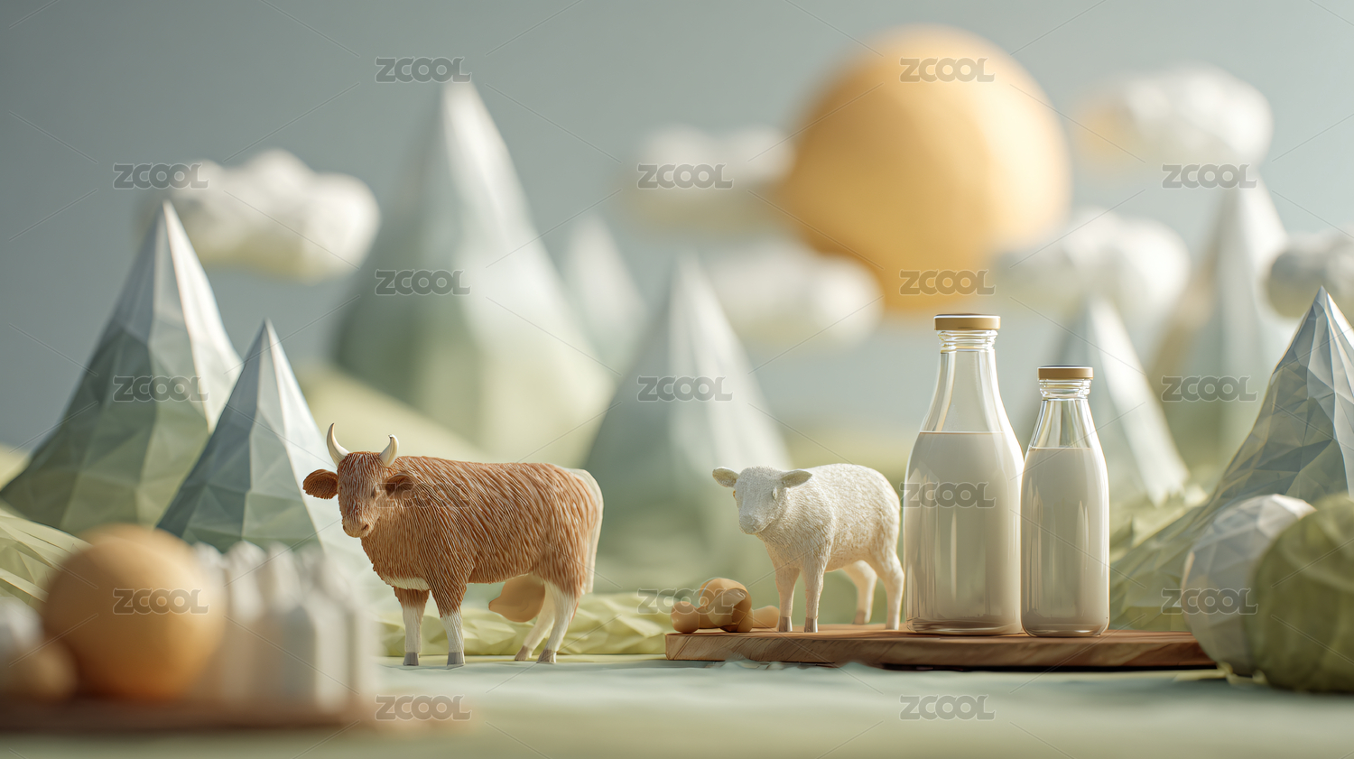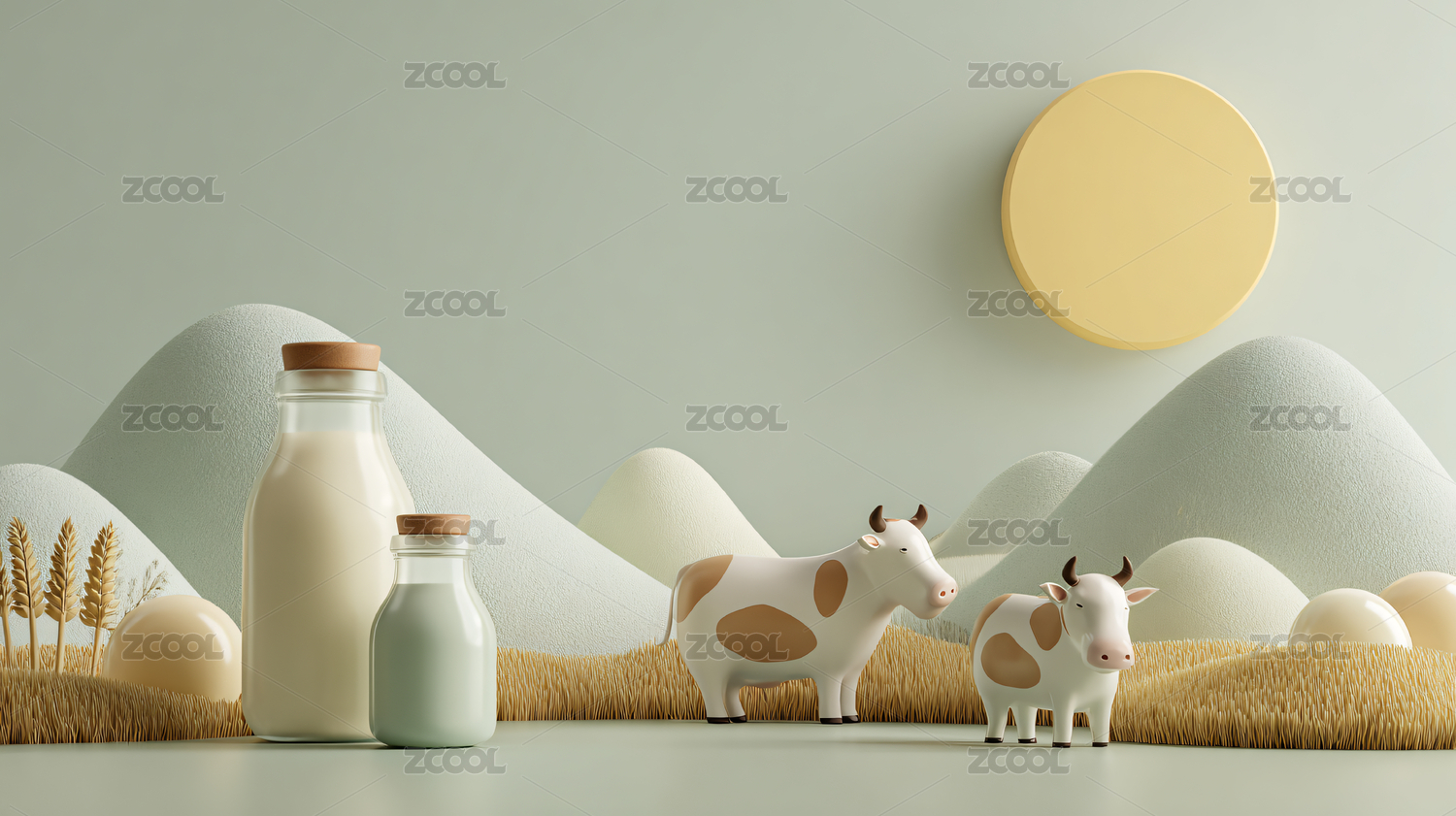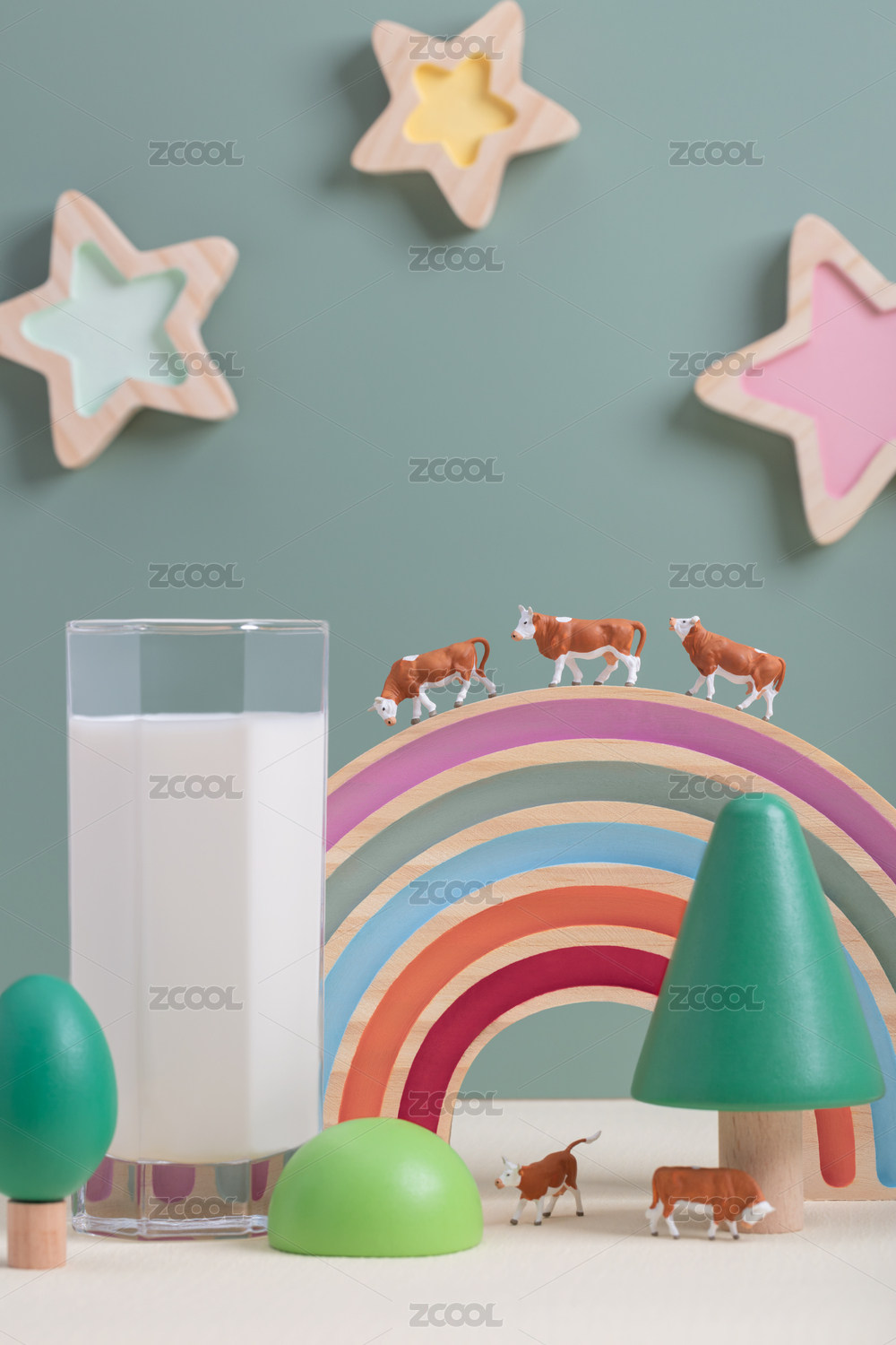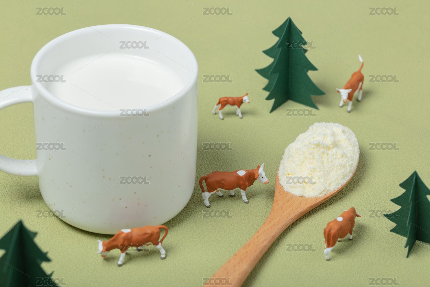 微缩创意一杯牛奶与森林牧场里的奶牛