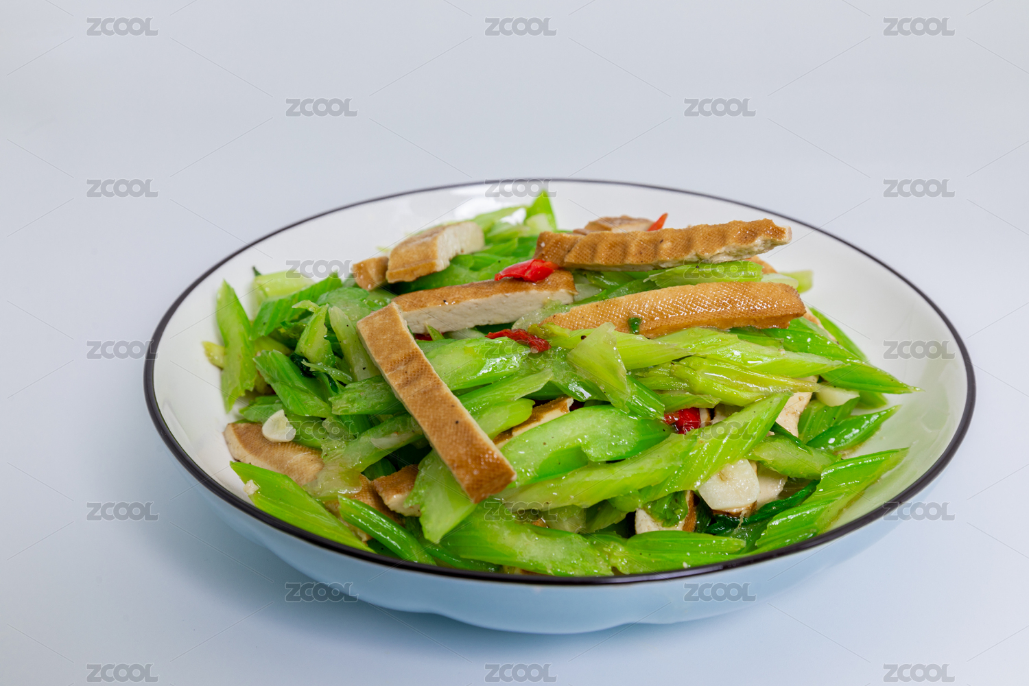 实木桌上餐盘里的西芹炒豆腐干