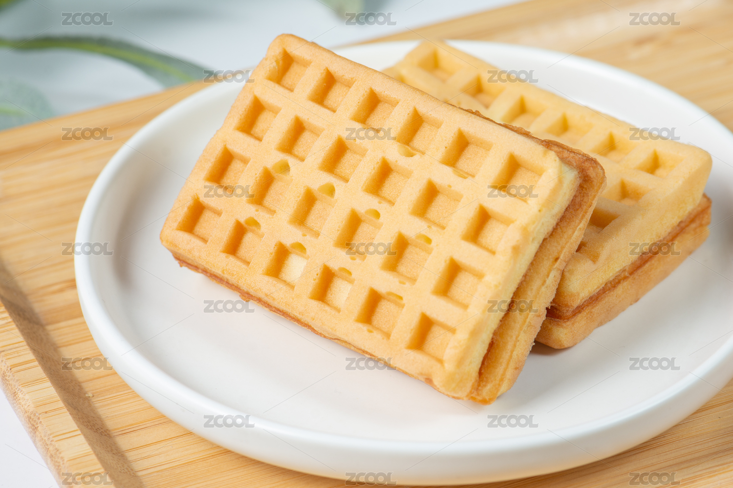桌面上的白色陶瓷盘子里美味可口的华夫饼