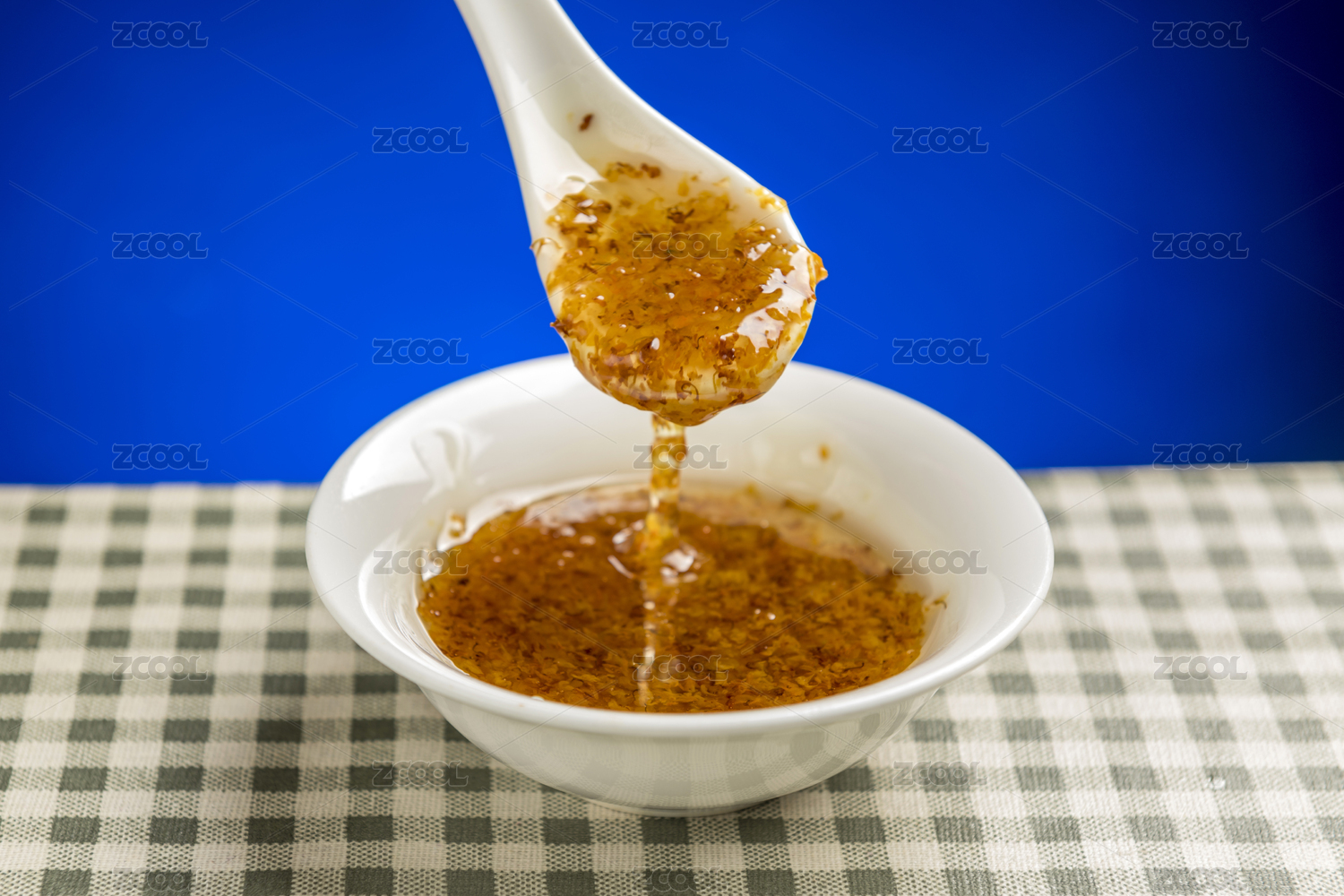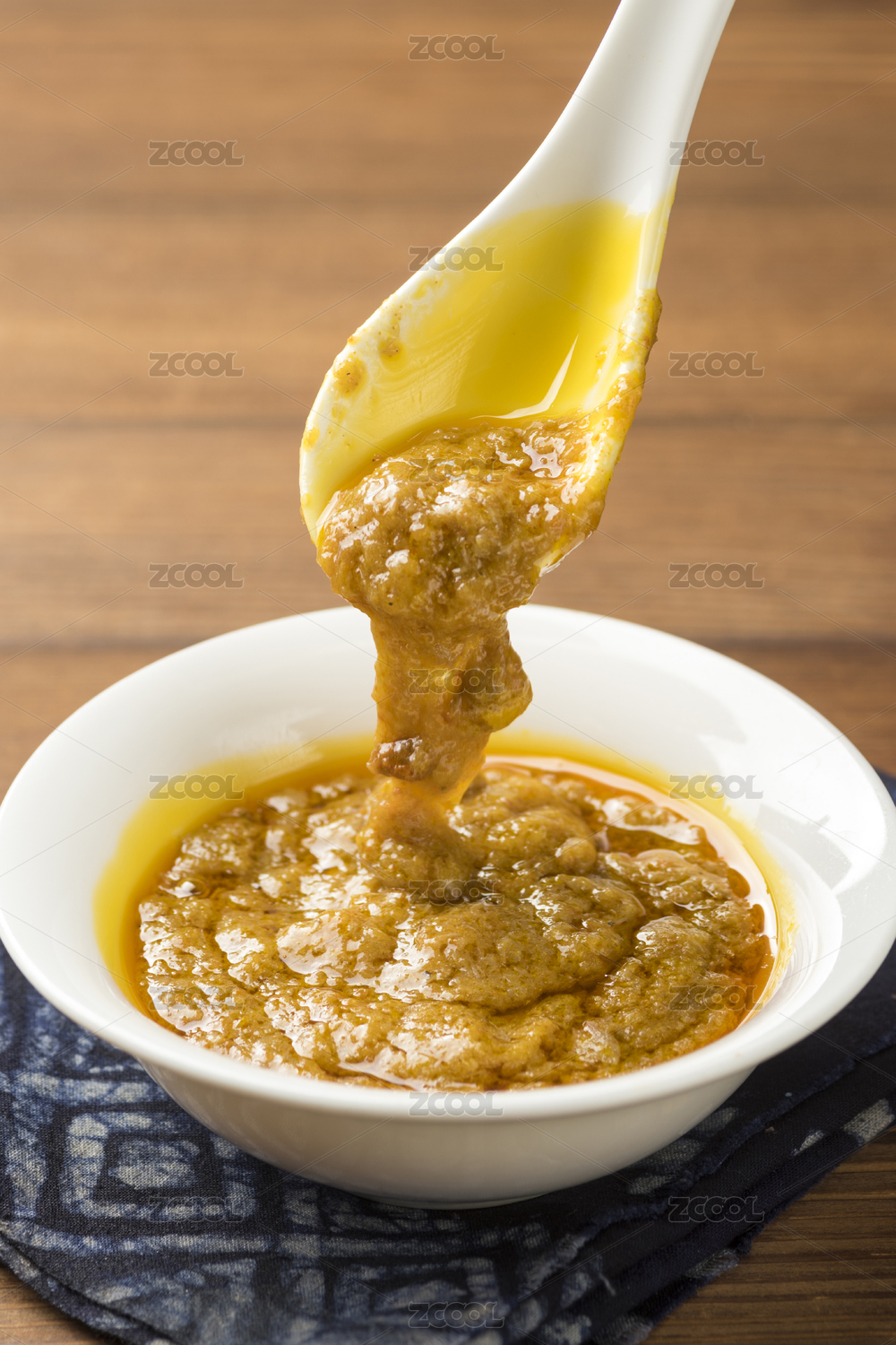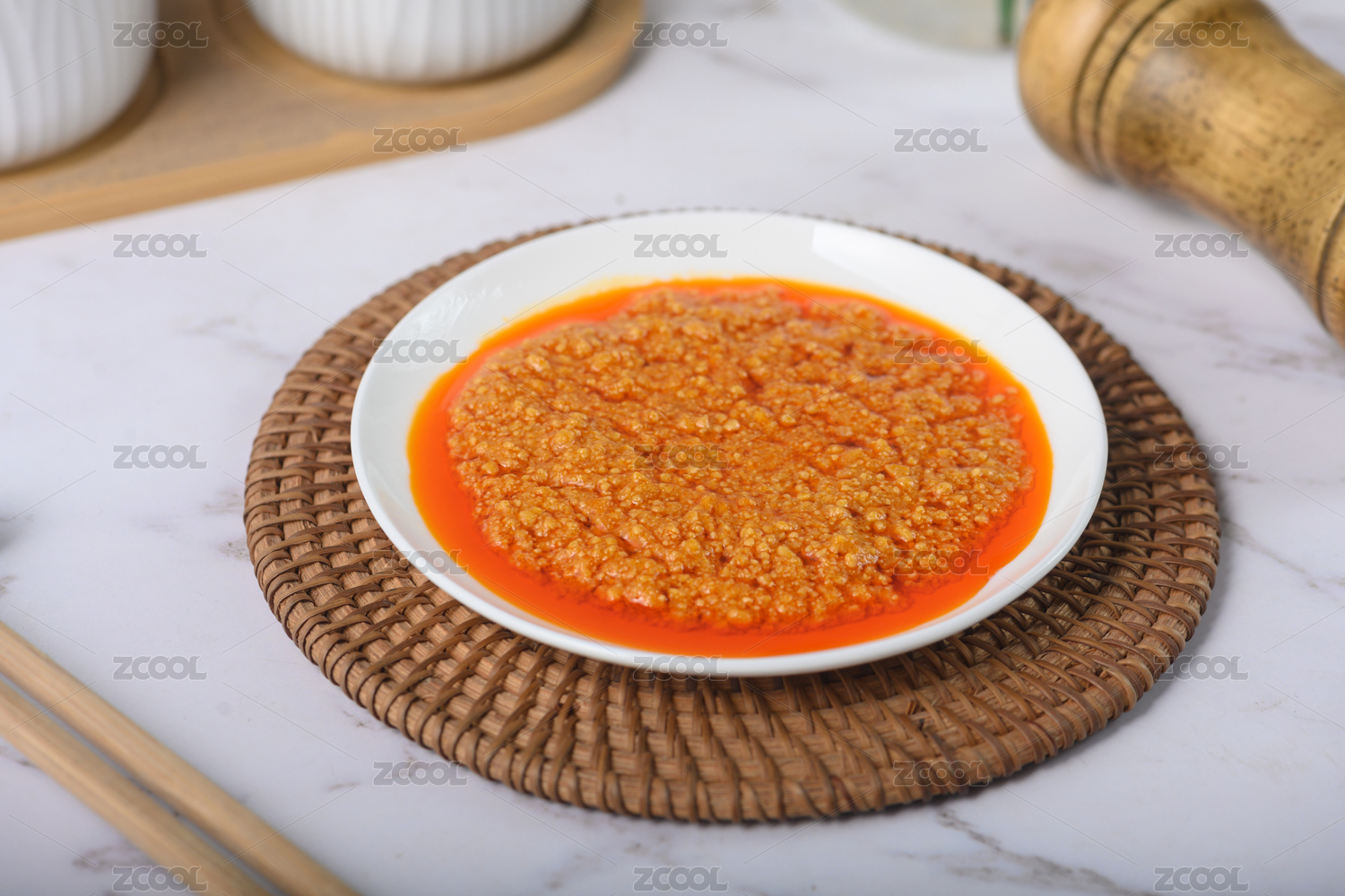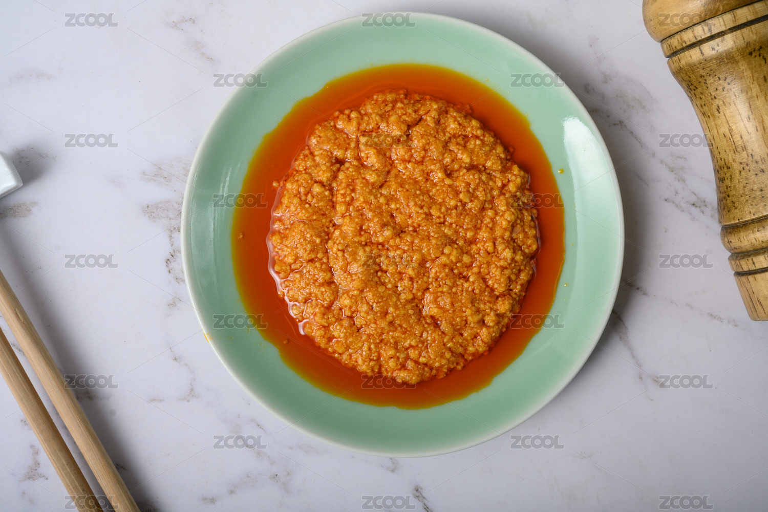 蟹黄鲜酱摆放在桌面上勺盛蟹黄酱特写