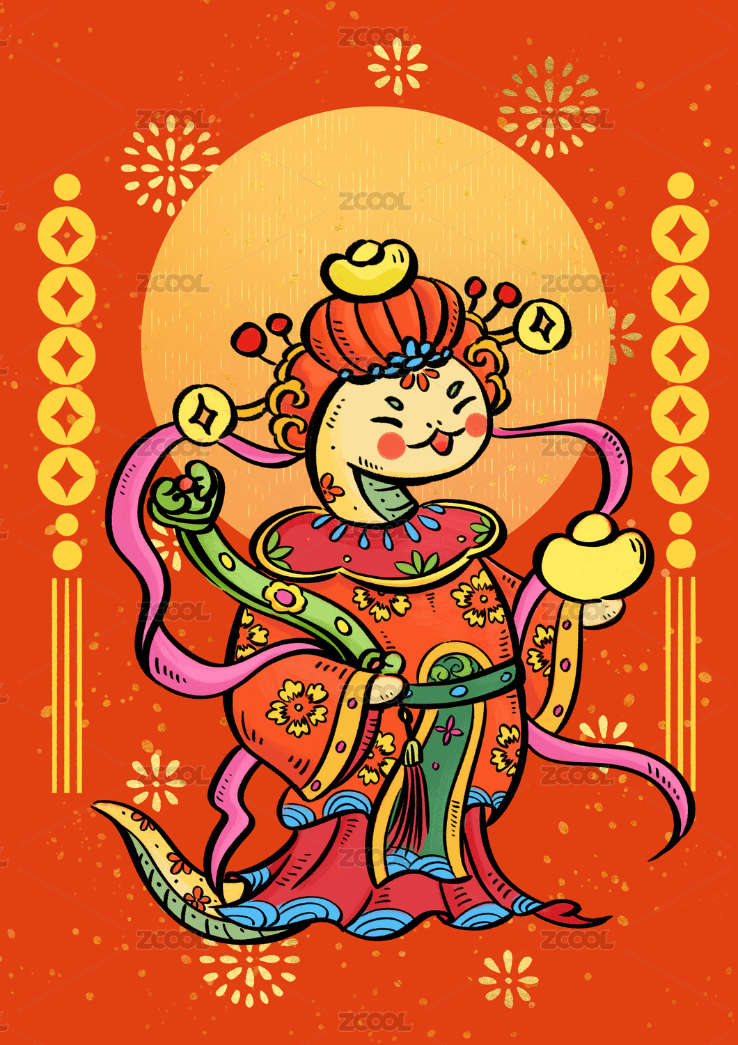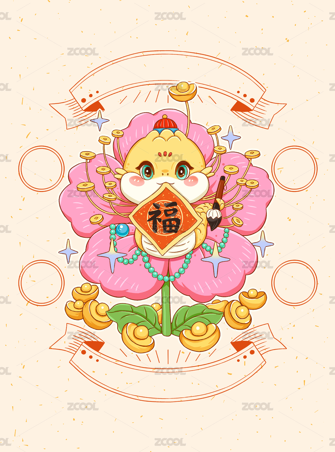 蛇年,蛇,福字,元宝,卡通,喜庆,可爱,国潮,新年,插画