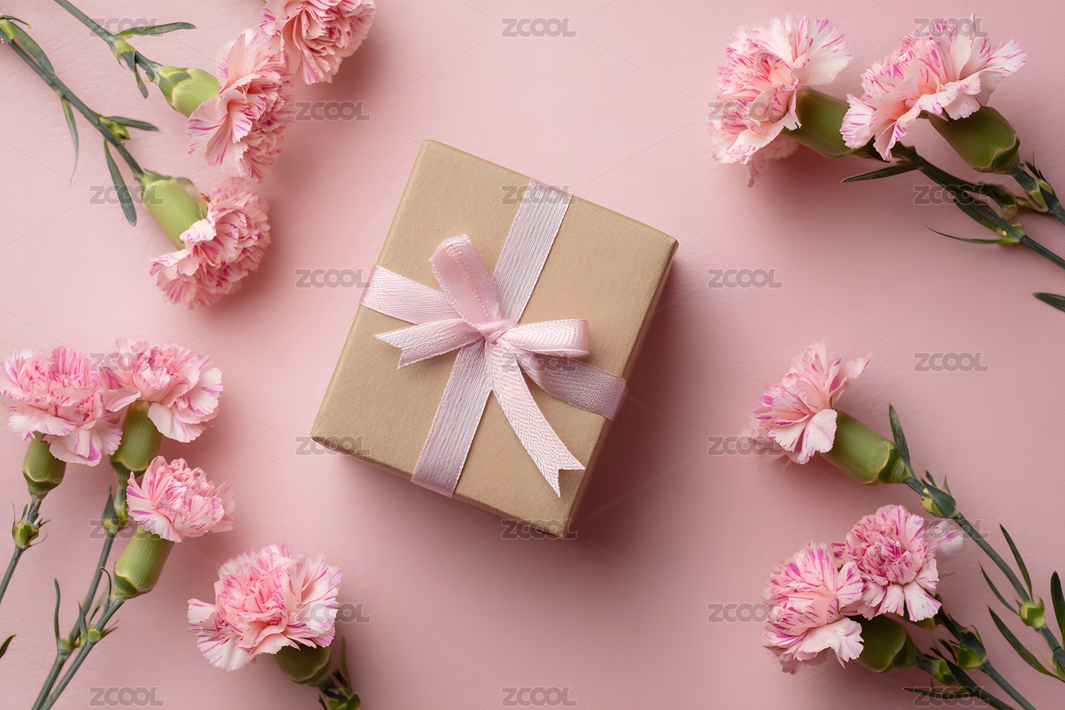 一朵粉色康乃馨和一个礼盒