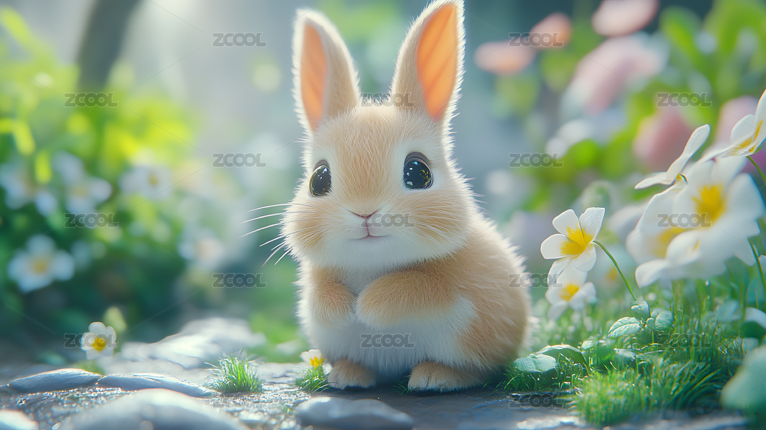 可爱的小兔子在花丛中玩耍