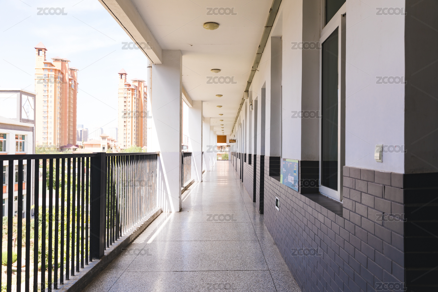 明亮开阔的校园教室外的走廊