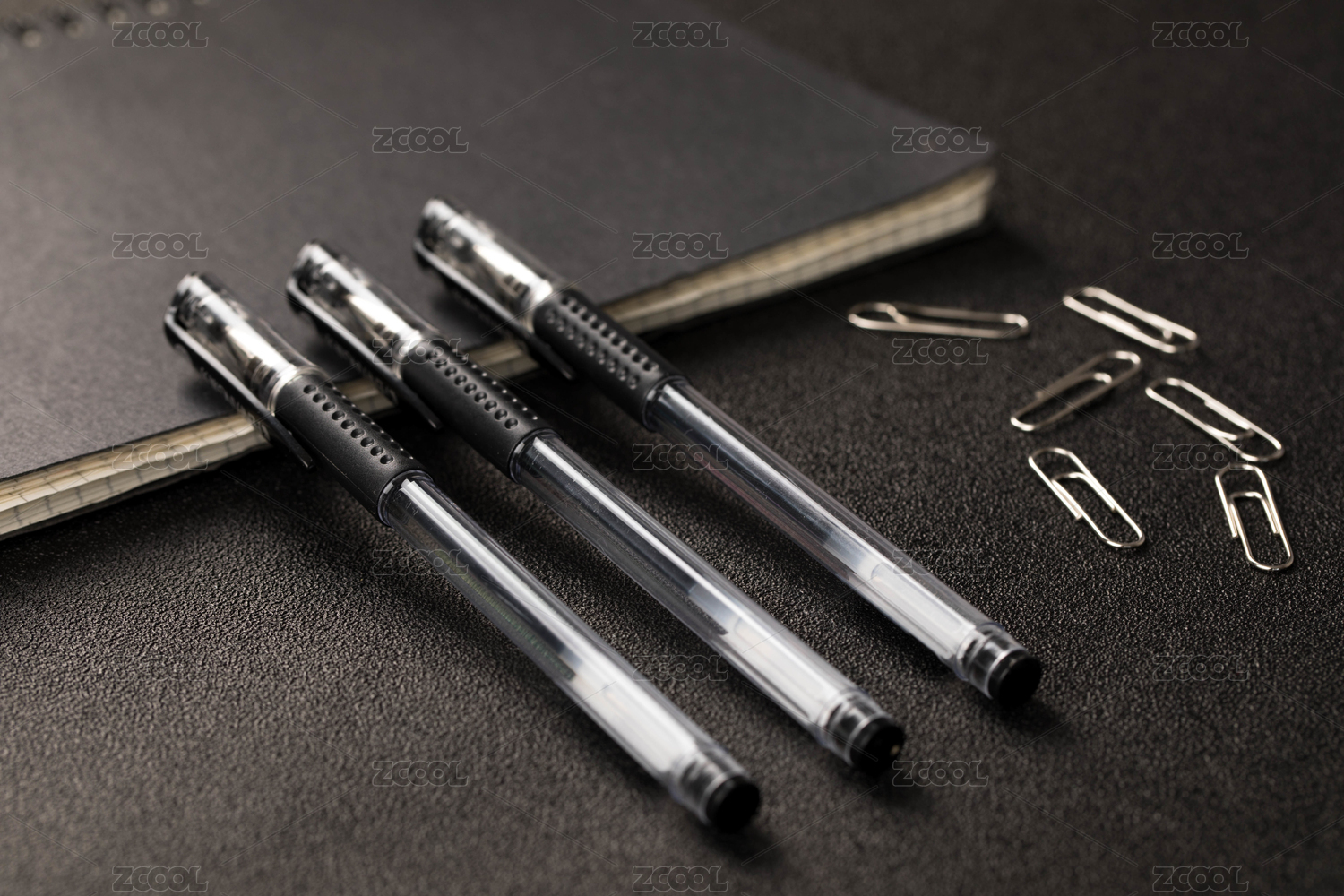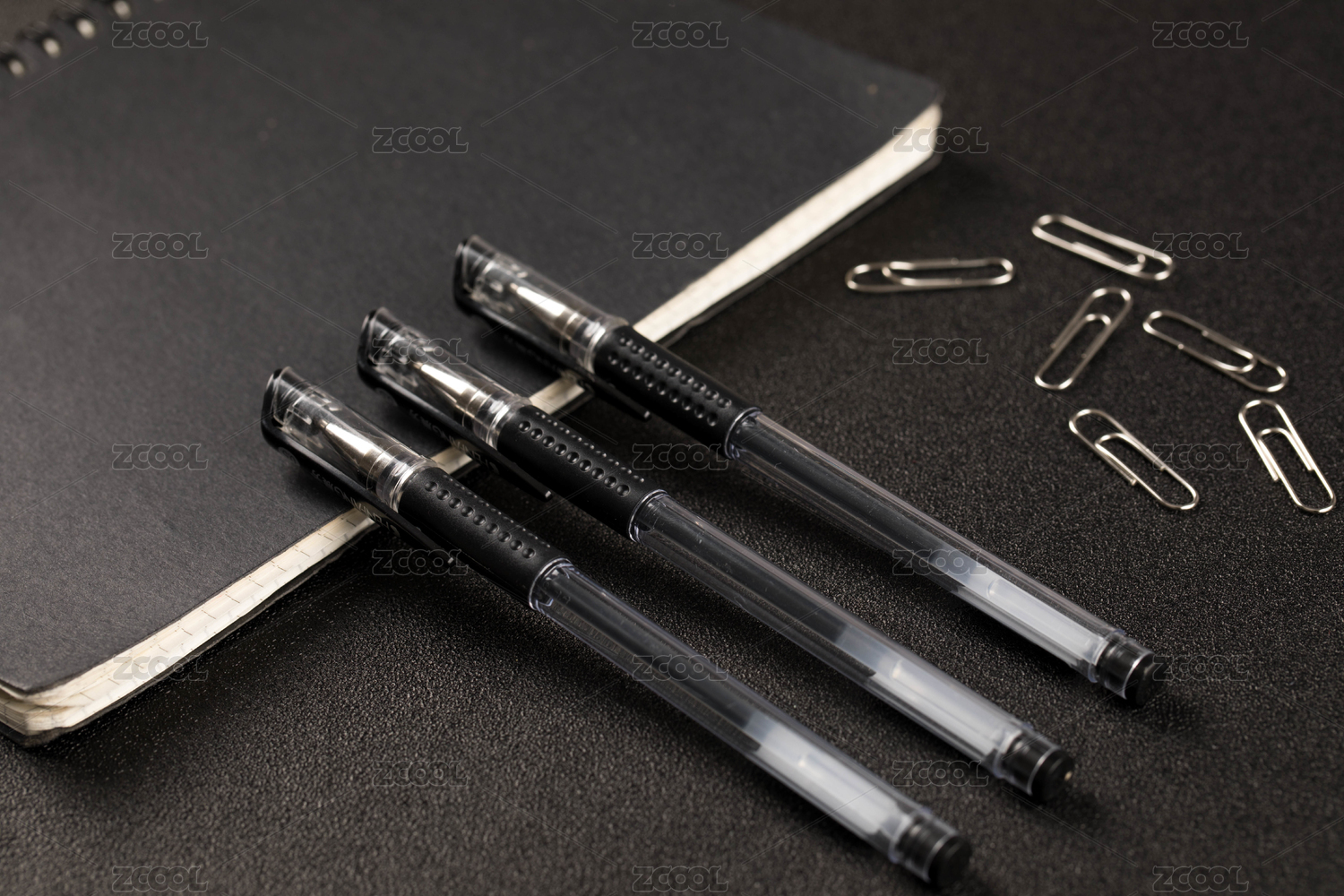 三只黑色中性笔靠在黑色笔记本上,旁边还放着一些回形针